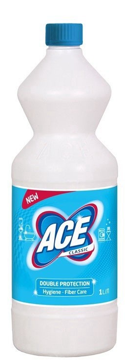 Šķidrs audumu balinātājs un dezinfekcijas līdzeklis ACE. Balinātājs ir īpaši efektīvs, jo tā formulā esošās īpašās sastāvdaļas nodrošina nevainojamu audumu baltumu, nebojājot audumu. Higiēniski tīra lielas virsmas. Pirms lietošanas virsma nav papildus jānotīra. Var izmantot baltas veļas mazgāšanai gan ar rokām, gan veļas mašīnā. Viegli izskalojams. Tilpums: 1 litrs.