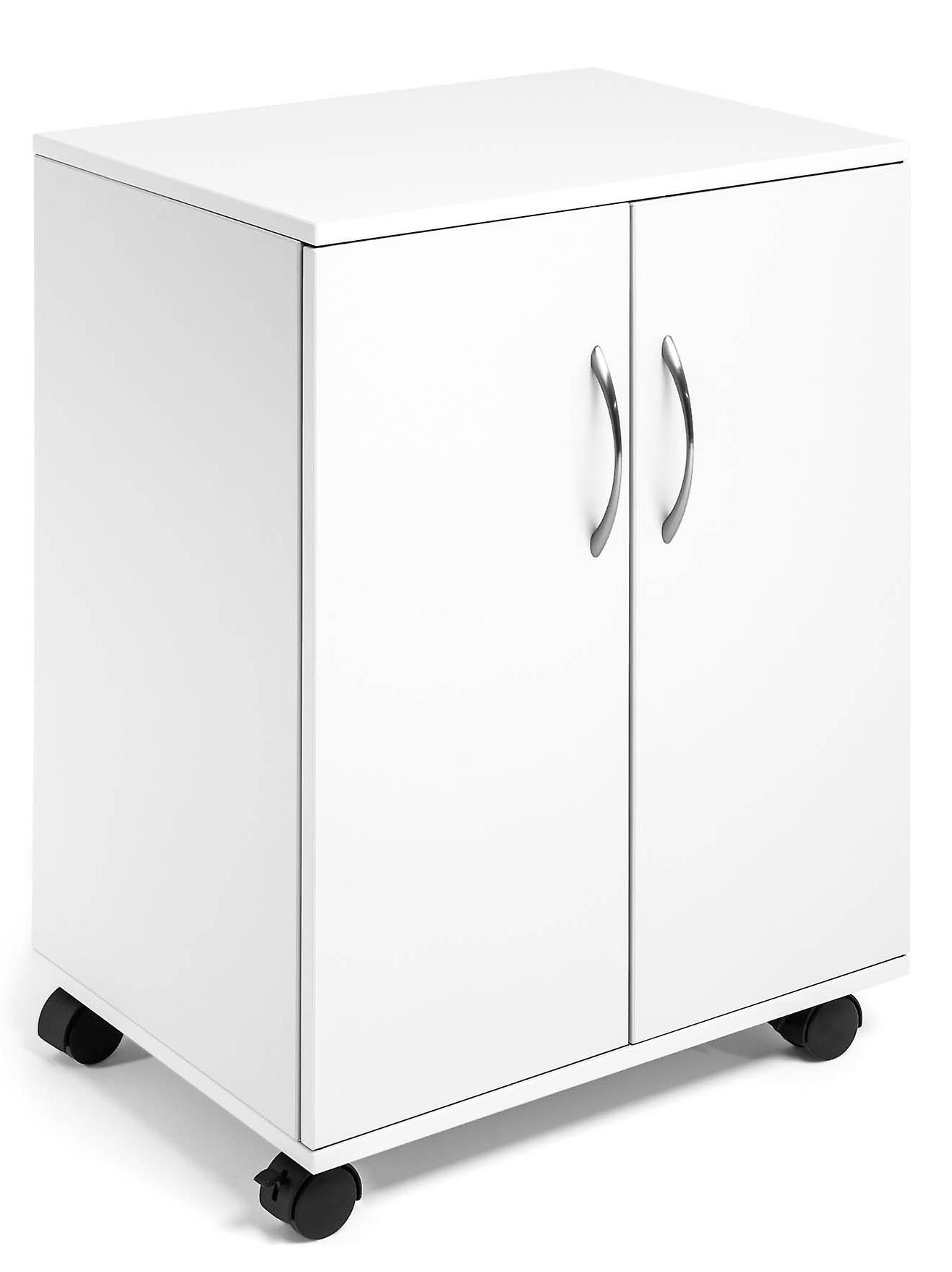 Daudzfunkcionāls skapītis, DURABLE, slēgts, balts. Ar 2 iebūvētiem plauktiem, 2 regulējamiem plauktiem un 2 spārnu durvīm. Viens plaukts iztur līdz 30 kg. Augstas kvalitātes 16 mm bieza ar melamīnu klāta koksne aizsargā pret skrāpējumiem. Pilnībā mobils, ar 4 riteņiem, 2 ar bremzēm, lai būtu stabils lietošanas laikā. Izmēri: 528 x 748 x 400 mm.