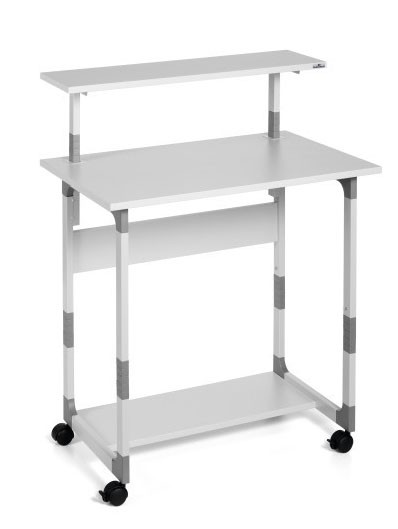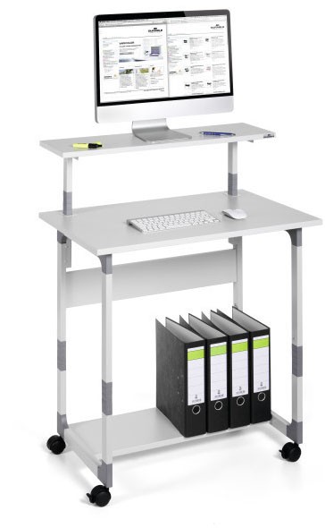 Mobils datorgalds DURABLE 80 VH. Galds ar vertikāli regulējamu monitora un tastatūras plauktu. Apakšējo plauktu var izmantot kā papildu uzglabāšanas vietu. Pelēkā krāsā. Izmēri: 800 x 920-1220 x 564 mm.