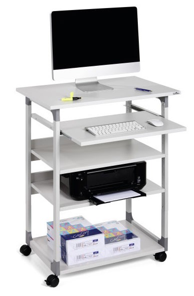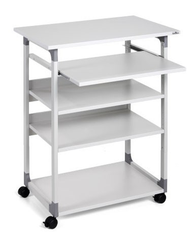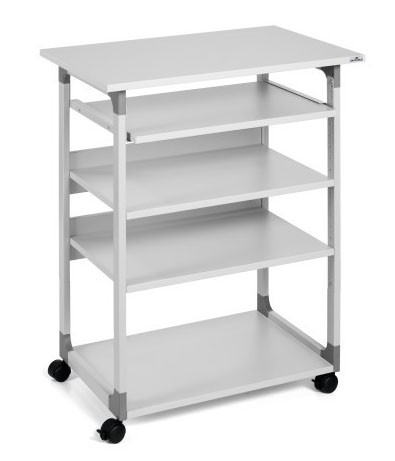 Mobils datorgalds DURABLE 72 VH. Galds ar četriem plauktiem, speciāli izstrādāts kustīgām darba vietām, kur nepieciešama ātra piekļuve datoriekārtām. Universāls dizains ar monitora plaukta augstuma regulēšanu 960-1240 mm robežās ar 20 mm soli, tastatūras plauktu, bet vidējais plaukts ļauj ierīci izmantot sēžot vai stāvot, atkarībā no personīgajām vēlmēm. Pelēkā krāsā. Izmēri: 750 x 950-1150 x 534 mm.