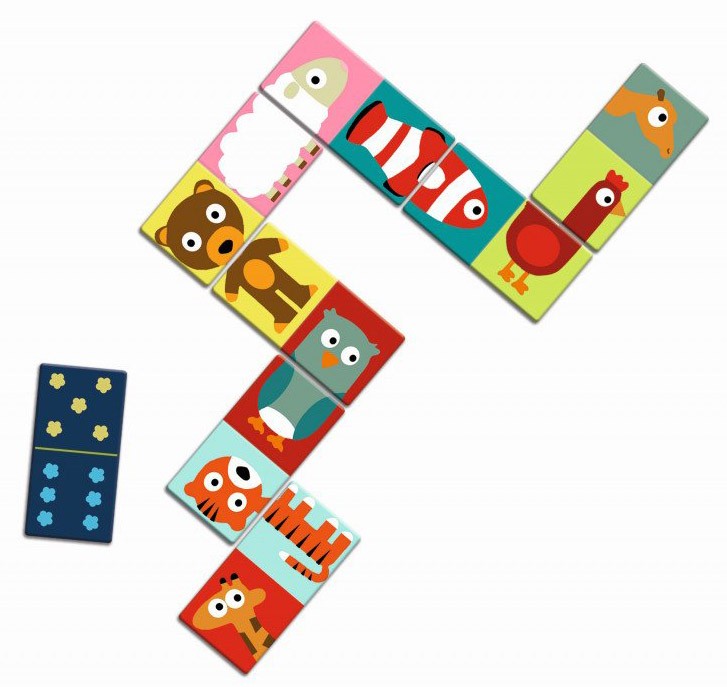 Izglītojoša domino puzle DJECO Animo ir skaisti izstrādāta un krāsaina attēlu atpazīšanas un skaitļu saskaņošanas spēle. Katra domino detaļa ir izgatavota no bieza, izturīga kartona. Vienā detaļas pusē ir mīlīgu dzīvnieku attēli, bet otrā – krāsaini punkti. Šīs ir divas spēles vienā. Mazie varēs likt domino, atrodot dzīvnieka otro daļu vai atrodot tādu pašu punktu skaitu. Spēle palīdz bērniem iepazīt dzīvniekus un mācīties skaitīt. Attīsta sīko motoriku, vērīgumu, ātru orientāciju. Ieteicams bērniem no 3 gadu vecuma. Brīdinājums! Nav piemērots bērniem, kas jaunāki par trim gadiem. Sīkas detaļas, aizrīšanās risks. Lietot pieaugušo uzraudzībā. Puzli veido 28 domino kartītes.