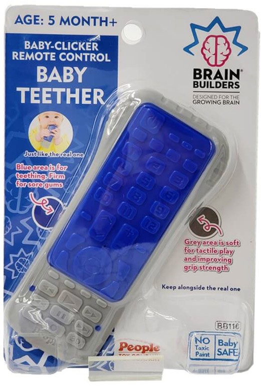 Jūsu mazulim patīk košļāt telefonu vai tālvadības pulti? Daudzi saskaras ar šo problēmu! BRAIN BUILDERS košļājamā rotaļlieta “Mazuļu TV pults” ir vienkārša alternatīva, mazulis to iemīlēs vēl vairāk nekā īsto pulti! Pults vietā iedodiet mazulim košļājamo rotaļlietu un vērojiet, kā viņš patīkami aizmirstas košļājot. Košļājamā rotaļlieta ir viegli nomazgājama, tā ir higiēniska alternatīva īstajām tālvadības pultīm! Lieliski piemērota, kad bērnam sāk šķelties zobiņi. Ar dažādām virsmām: zilā virsma ir cietāka, pelēkā – mīkstāka. Pelēkā virsma ir paredzēta taustes sajūtas un pirkstu spēka attīstīšanai. Zilā virsma paredzēta košļāšanai, lieliski piemērota sāpīgām dantenām. Rotaļlieta ir droša un ērta lietošanā, sastāvā nav BPA, ftalātu. Atbilst ASTM F963 un EN71 prasībām. Kopšana: pirms lietošanas notīriet rotaļlietu ar mitru salveti vai nomazgājiet ar maigām ziepēm. Nosusiniet. Nemērciet ūdenī. Tīrīt ar ūdeni un ziepēm. Ieteicams bērniem no 5 mēnešu vecuma. Brīdinājums! Pirms rotaļlietas nodošanas bērnam noņemiet produkta iepakojumu. Saglabājiet iepakojumu. Pamanot rotaļlietas bojājumu, izmetiet to un nomainiet pret jaunu. Lietot pieaugušo uzraudzībā. Iepakojuma izmēri 18x12,5x3.