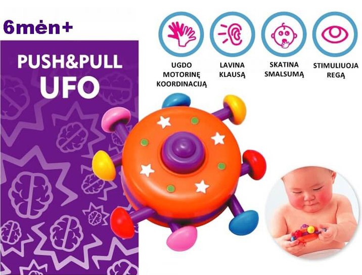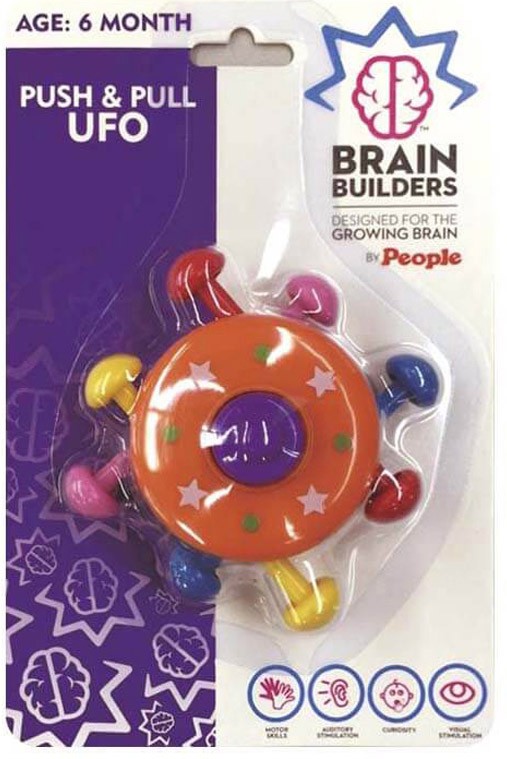 Interaktīvā spēle BRAIN BUILDERS “UFO”. Lidojošā šķīvīša formas rotaļlieta ar astoņām krāsainām pogām, kuras var stumt, vilkt un spaidīt. Izdod skaņas. Attīsta motoriku un palīdz saprast cēloņu-seku sakarību. Bez BPA un ftalātiem. Ieteicams bērniem no 6 mēnešu vecuma. Iepakojuma izmēri: 20x13x5 cm.
