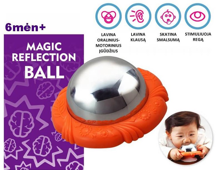 Spoguļbumba BRAIN BUILDERS “Maģiskie atspulgi”. Izliektā forma rada interesantus atspulgus, kas piesaista mazuļa uzmanību. Ar piesūcekni var piestiprināt pie barošanas galdiņa vai loga. Iekšpusē integrēts grabulis. Drošs, bez BPA. Ieteicams bērniem no 6 mēnešu vecuma. Iepakojuma izmēri: 20x15,5x9 cm.