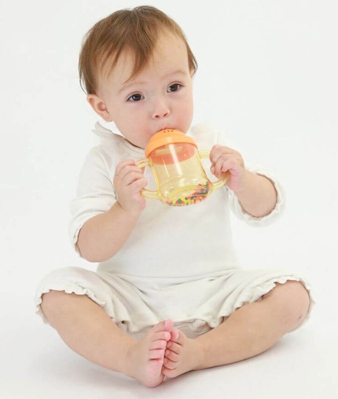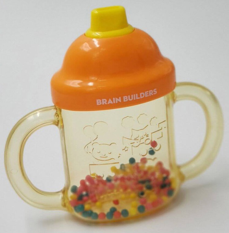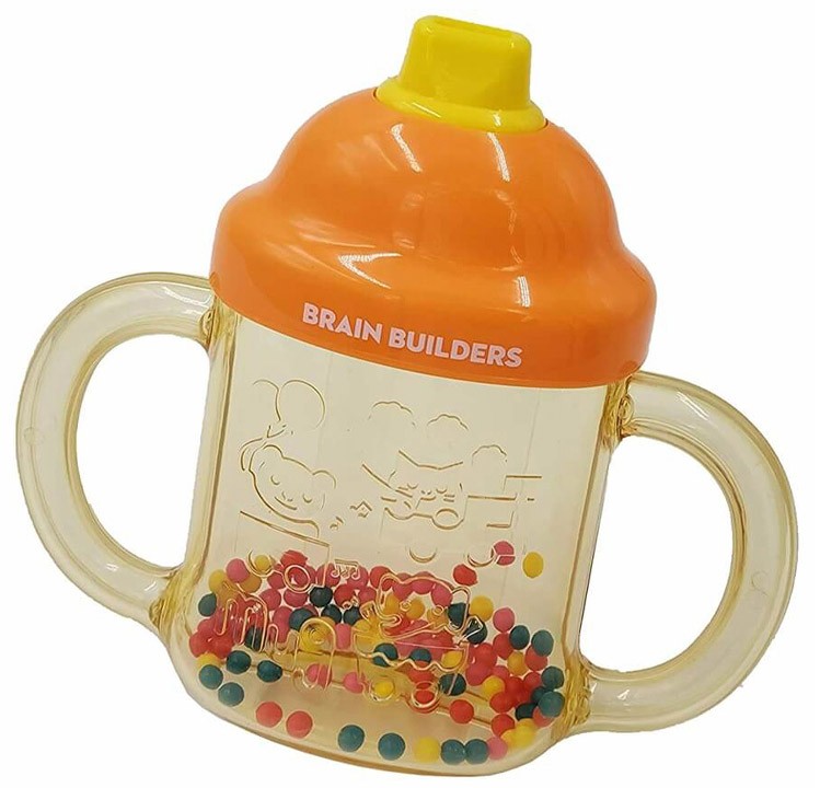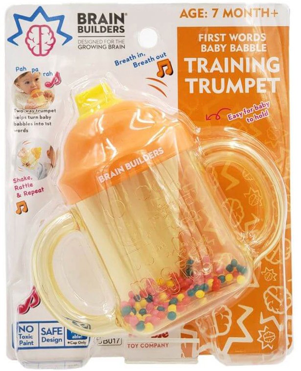 BRAIN BUILDERS “Pirmie vārdi”. Divpusēja taure, kas veicina runas muskulatūras attīstību. Svilpe izdod maigu skaņu gan pūšot, gan ieelpojot. Grabulis un kramtukas (košļājamā rotaļlieta) vienā. Viegli tīrāms. Ieteicams bērniem no 7 mēnešu vecuma.