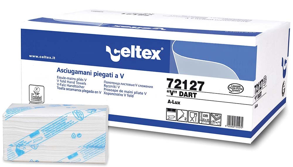 Augstas kvalitātes papīra dvieļi loksnēs CELTEX V Dart. Kods: 72127. Materiāls: celuloze. Krāsa: balta. Slāņi: 2. Locīšanas veids: V forma. Lokšņu skaits: 200 gab. Atvērtas loksnes izmēri: 21,5x22 cm. Pārdod pa 1 pakai, iepakojumā 15 pakas. Dvieļi labi absorbē mitrumu un ir ļoti izturīgi. Atbilst visām higiēnas prasībām. Videi draudzīgi (otrreizēji pārstrādāti materiāli). Save Plus sērija, ekoloģiska prece ar PEFC sertifikātu. Piemērots turētājiem: 92100 (melns) un 92120 (balts).