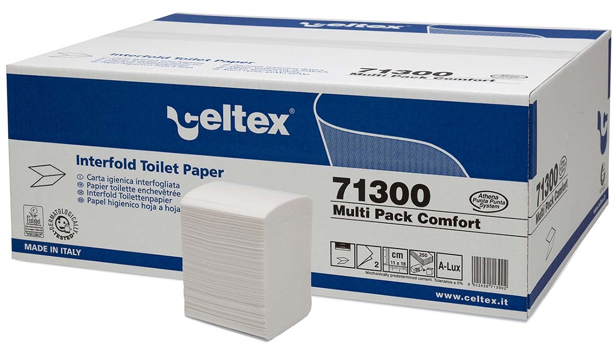 Augstas kvalitātes tualetes papīrs loksnēs CELTEX Multi Pack Comfort. Kods: 71300. Materiāls: celuloze. Krāsa: balta. Slāņi: 2. Locīšanas veids: V forma. Lokšņu skaits: 250 gab. Atvērtas loksnes izmēri: 11x18 cm. Pārdod pa 1 pakai, iepakojumā 36 pakas. Videi draudzīgs, daļa materiālu ir otrreizēji pārstrādāti. Save Plus sērija, ekoloģiska prece ar PEFC sertifikātu. Piemērots turētājiem: 92260 (melns) un 92270 (balts).