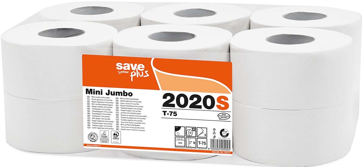 Tualetes papīrs rullī CELTEX Mini Jumbo, ražots bez hlora balinātājiem. Kods: 2020S. Materiāls: jaukta šķiedra. Krāsa: balta. Slāņi: 2. Ruļļa garums: 150 m. Ruļļa platums: 9 cm. Ruļļa diametrs: 19,50 cm. Loksnes izmēri: 9x15 cm. Lokšņu skaits 1 rullī: 1000 gab. Ekoloģiska prece, PEFC sertifikāts. Piemērots turētājiem: 92210 (melns) un 92230 (balts). Pārdod pa 1 rullim, iepakojumā 12 ruļļi.