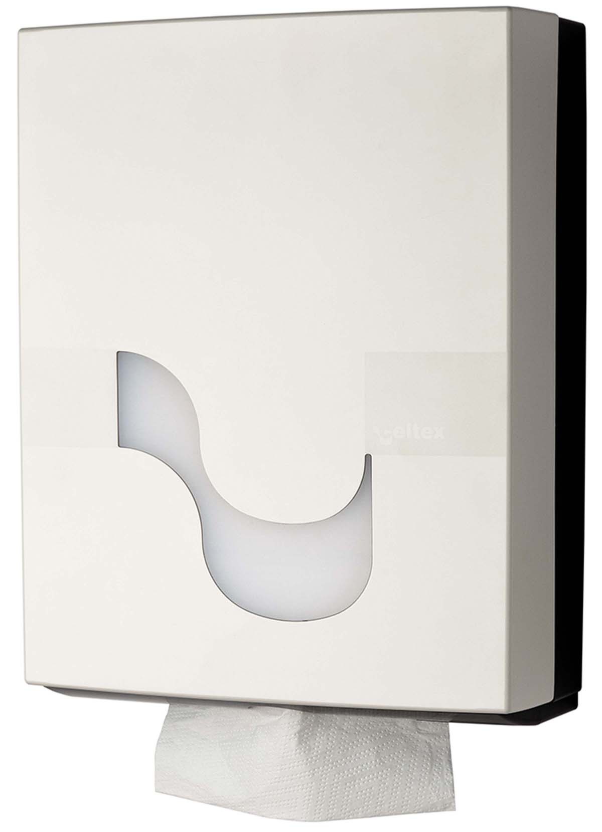 Papīra dvieļu lokšņu turētājs CELTEX Folded Hand towel, 92120. Materiāls: plastmasa. Krāsa: balta. Izmēri: augstums 36 cm, platums 27,5 cm, dziļums 12,5 cm. Slēdzams, vienkāršs un ērts dozators.