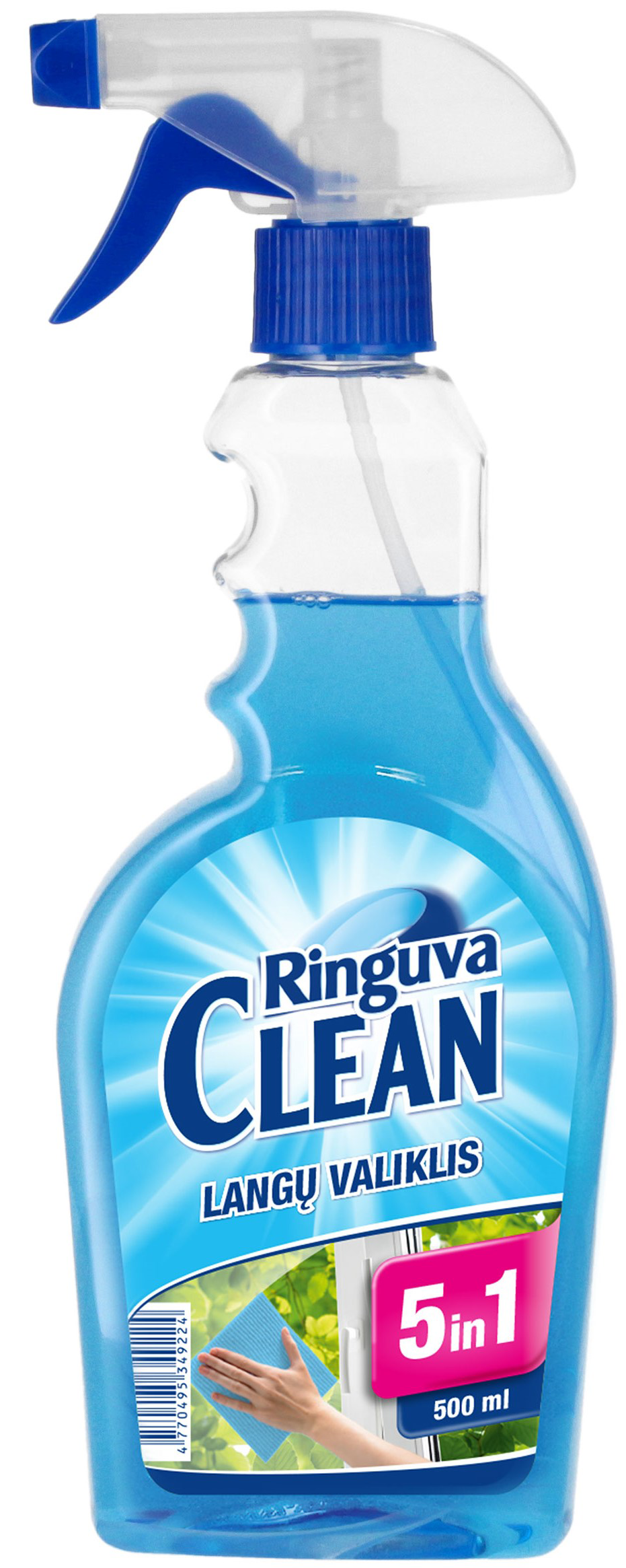 RINGUVA CLEAN logu tīrītājs 5in1 piemērots logu un dažādu gludu, spīdīgu un stikla virsmu tīrīšanai: spoguļiem, plauktiem, porcelānam, marmoram, keramikas flīzēm, elektriskajām plītīm u.c. Ātri un efektīvi likvidē netīrumus, neskrāpē tīrāmo virsmu, ātri žūst, piešķir spīdumu, aizsargā tīrāmās virsmas no kondensāta veidošanās. Lietošana: uzsmidzināt uz tīrāmās virsmas un noslaucīt ar tīru, sausu drānu vai papīra dvieli. Izsmidzināt aptuveni 20 cm attālumā no virsmas. Sastāvs: