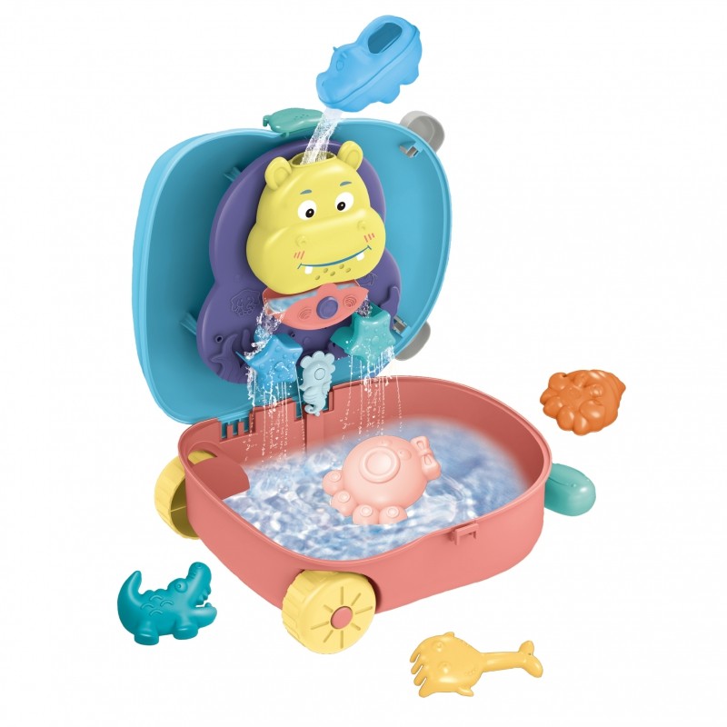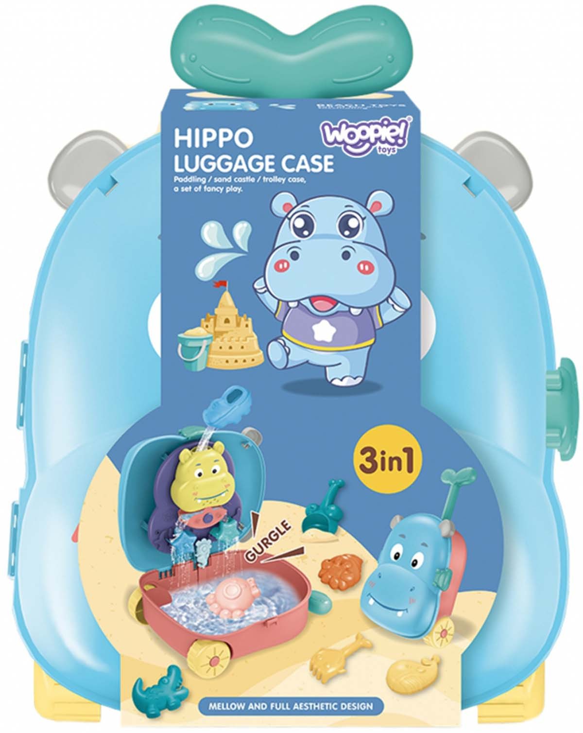 Paņem WOOPIE koferi, kas ir pilns ar prieku un pārsteigumiem, un dodies rotaļāties uz pagalmu vai pludmali. Koferī ir viss nepieciešamais jautrai laika pavadīšanai! To ir ērti paņemt līdzi uz rotaļu vietu – jutīsies kā īsts ceļotājs. Ierodoties atver koferi, piepildi to ar ūdeni un lej ūdeni uz rotaļu ierīces. Vēro, kas notiek! Tās ir trīs rotaļlietas vienā: koferis, ūdens rotaļlietas un smilšu rotaļlietas. Spēle attīsta bērna sajūtas un māca koncentrēt uzmanību. Jautri spēlēties gan vienam, gan kopā ar draugu. Piemērots bērniem no 3 gadu vecuma. Brīdinājums! Nav piemērots bērniem, kas jaunāki par 3 gadiem. Satur sīkas detaļas – aizrīšanās risks. Lietot pieaugušo uzraudzībā. Komplekta saturs: koferis ar ūdens dzirnaviņām, 2 dažādas lāpstiņas, 4 formiņas, trauks ūdenim. Iepakotā komplekta izmēri: 26 × 13 × 32 cm.