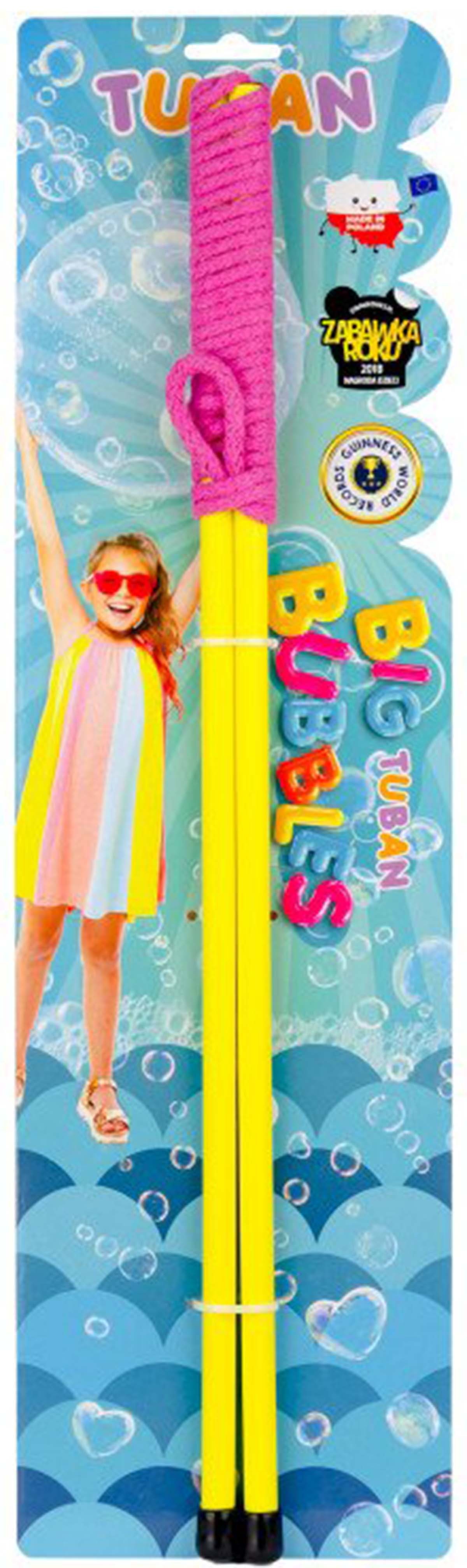 TUBAN milzu burbuļu nūja. Ar šo nūju var radīt gigantiskus burbuļus. Paredzēta lietošanai ar lielu daudzumu šķidruma. Nūjas garums 50 cm, virves garums 2 m. Brīdinājums! Virve rada nožņaugšanās risku. Lietot pieaugušo uzraudzībā.