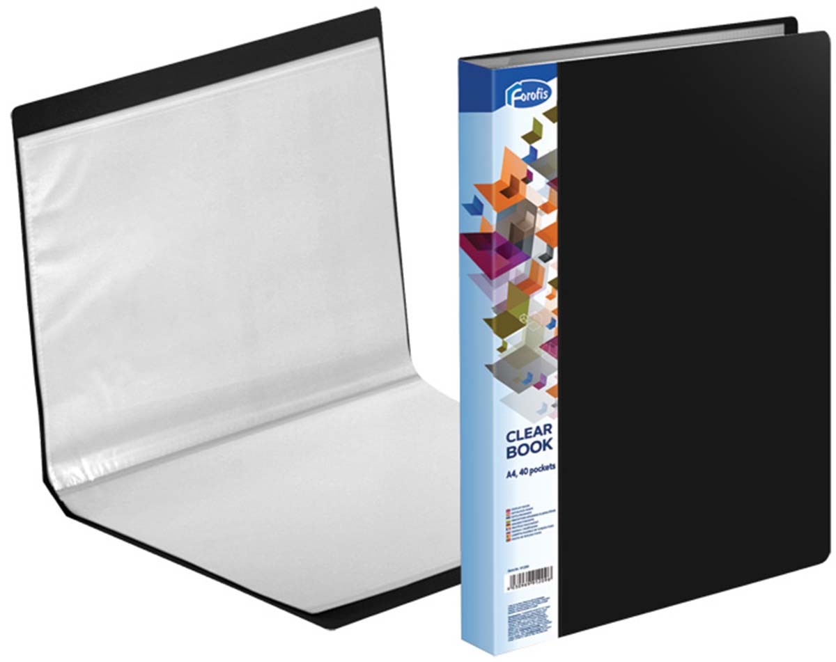 Mape ar kabatiņām FOROFIS. Lieliski piemērota prezentācijas materiāliem. Mīksts, melnas krāsas plastmasas vāks. Uz muguriņas ir josla ierakstiem. 40 kabatiņas. A4 formāts.
