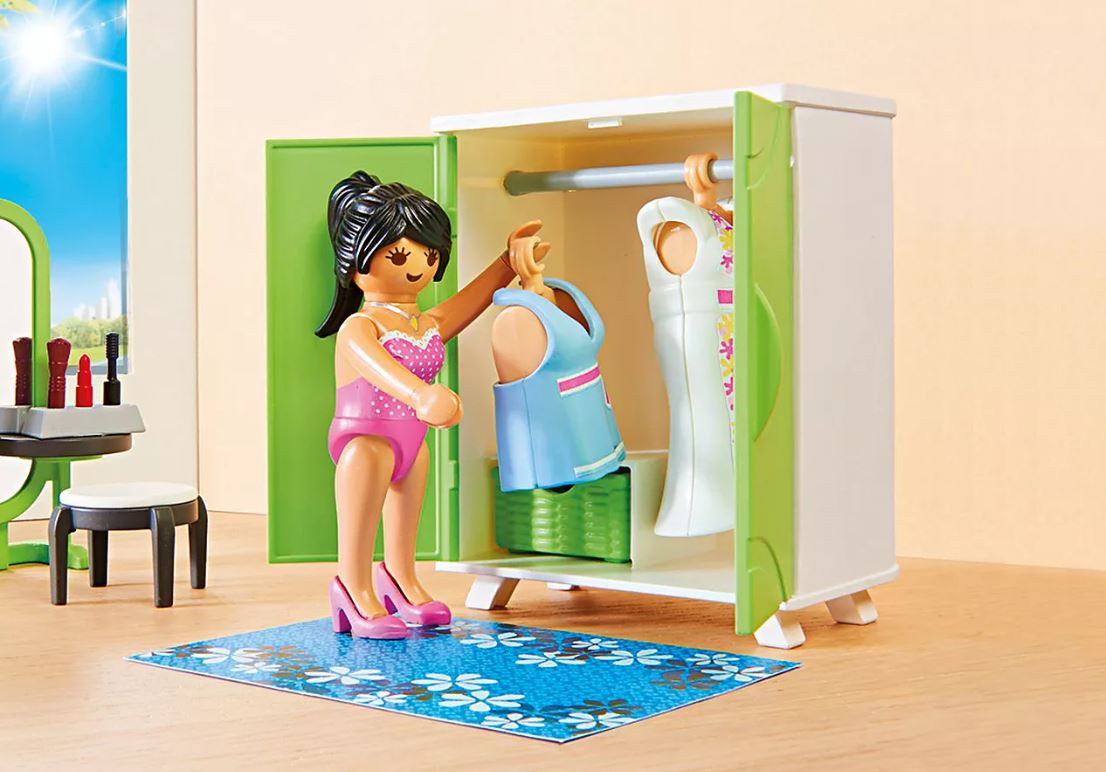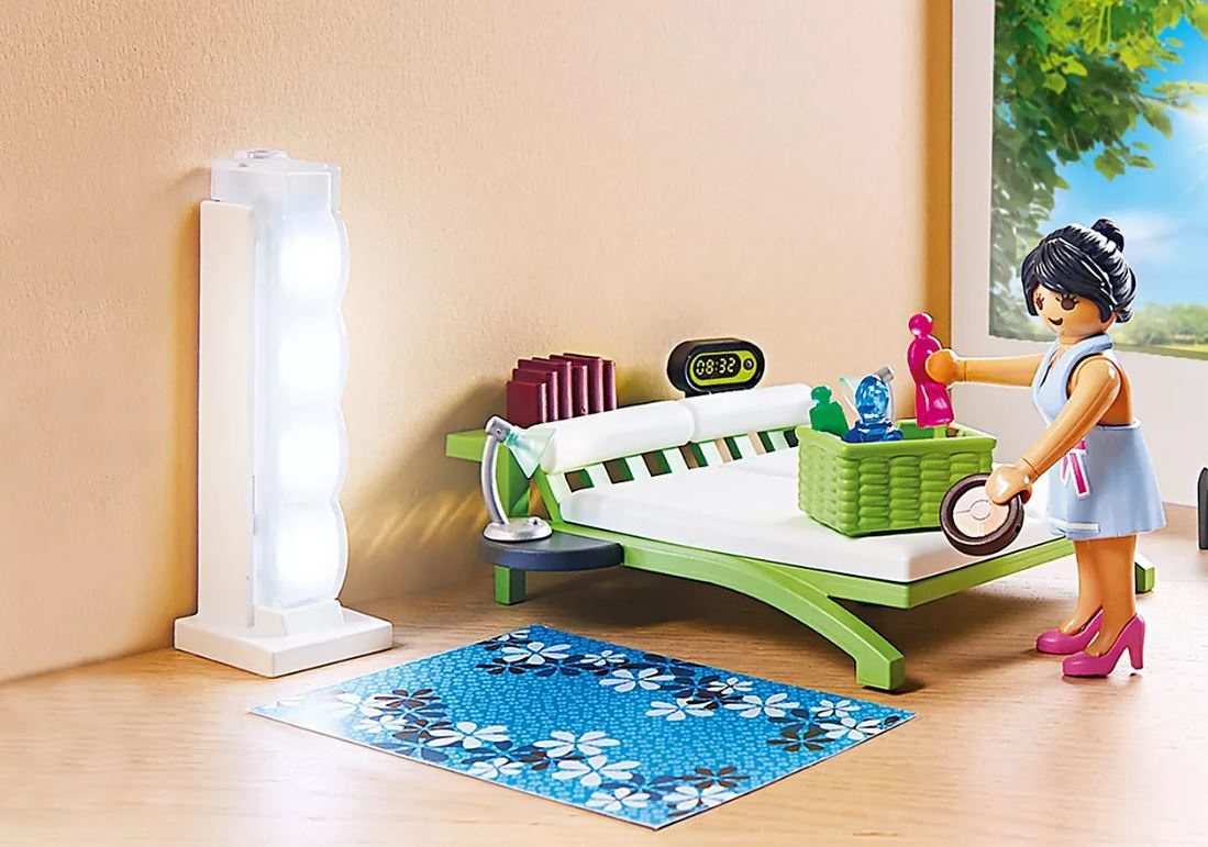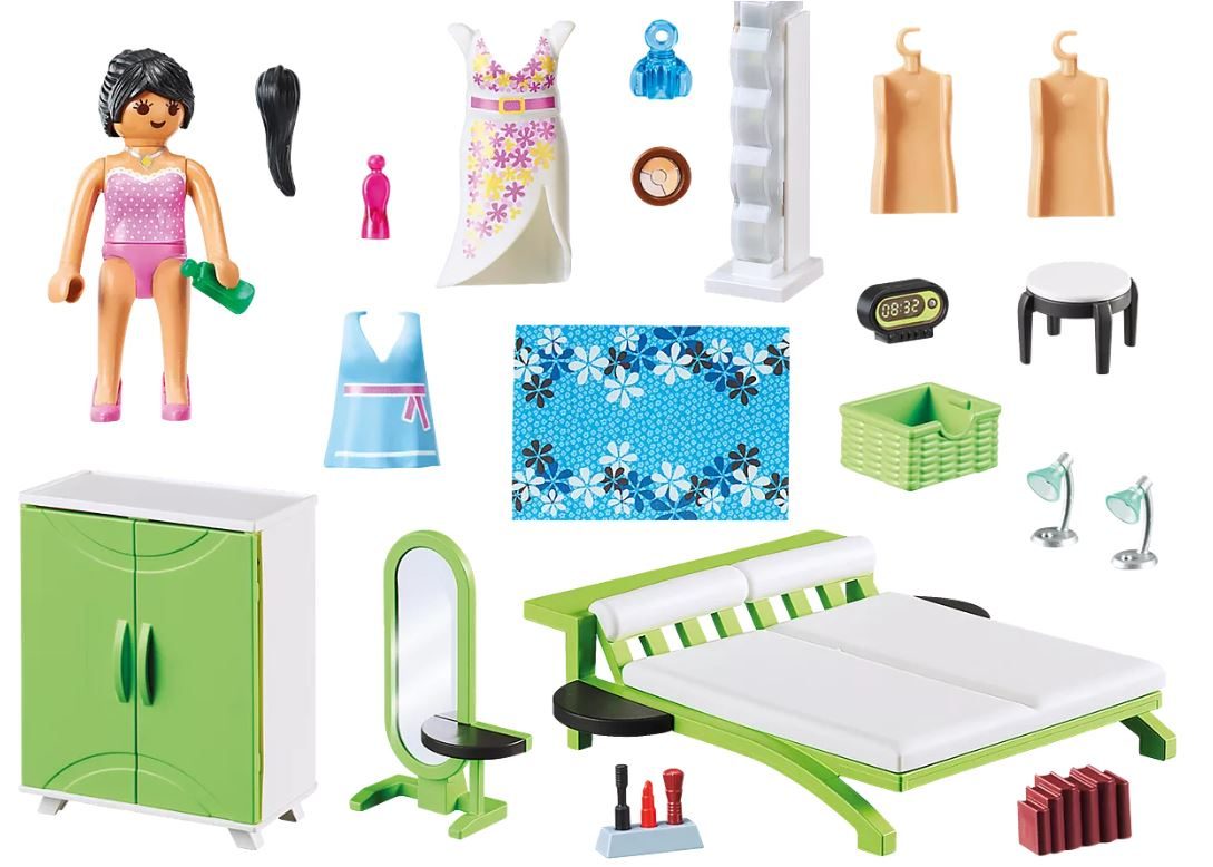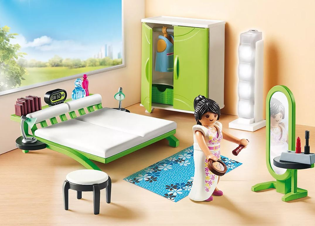 PLAYMOBIL Guļamistaba. PLAYMOBIL guļamistabā ir gulta, kosmētikas galdiņš, taburete, skapis, drēbes, kosmētika un spīdoša lampa (nepieciešama viena 1,5 V mazā baterija). Tajā lieliski izgulēsies un sagatavosies jaunai dienai. Ieteicams bērniem no 4 līdz 10 gadiem. Brīdinājums! Nav piemērots bērniem līdz trīs gadu vecumam. Sīkas detaļas, aizrīšanās risks. Lietot pieaugušo uzraudzībā. Nejauciet vecas un jaunas baterijas, lietojiet tās atbilstoši mērķim. Baterijas mainiet tikai pieaugušo uzraudzībā. Izlietotās baterijas utilizējiet atbilstoši noteikumiem. Komplektā ietilpst sievietes figūriņa, divguļamā gulta, drēbju skapis, gaismas kolonna, paklājs, kosmētikas spogulis, 2 kleitas, 2 pakaramie, taburete, 2 galda lampas, groziņš, matu aste, radio ar pulksteni, grāmatu kaudze, lūpu krāsa, tuša, pūdera otiņa, kompaktpūderis, flakons, kosmētikas pudelītes, spīdoša lampa.