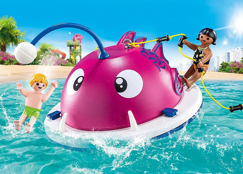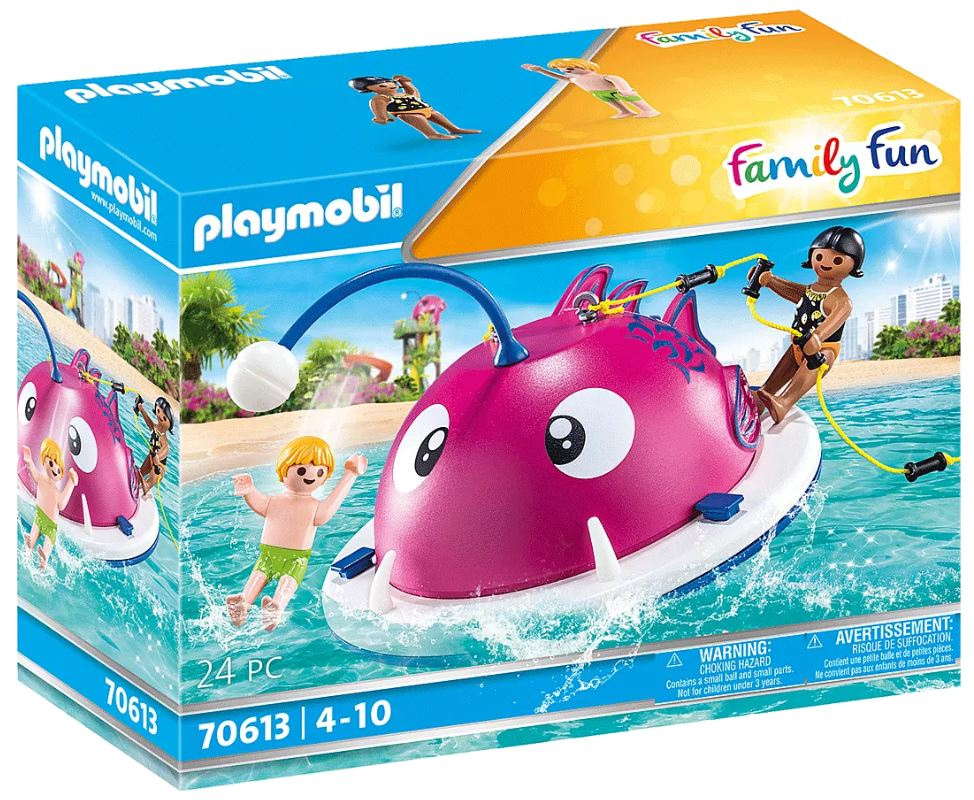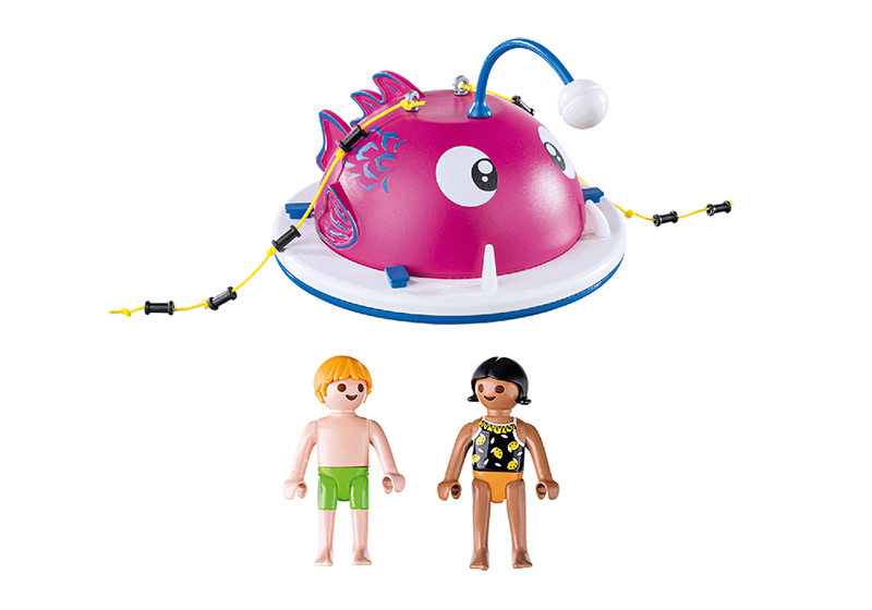 PLAYMOBIL Peldvieta: Peldošā sala. Kur varētu būt vēl jautrāk plunčāties un trakot, ja ne uz peldošās salas? Uzrāpties uz rozā zivtiņas formas saliņas nav nemaz tik vienkārši, taču pēc neliela treniņa tas izdodas diezgan viegli. Vispirms uzkāp pašā saliņas virsotnē un tad šļūc ūdenī. Izklaide var turpināties pat pēc tumsas iestāšanās, jo tev spīdēs lukturis un zivtiņas zobi. Ieteicams bērniem no 4 gadu vecuma. Brīdinājums! Nav piemērots bērniem līdz trīs gadu vecumam. Sīkas detaļas, aizrīšanās risks. Lietot pieaugušo uzraudzībā. Komplektā ietilpst meitenes un zēna figūriņas, peldoša zivs formas sala ar lukturiem, 2 virves. Komplektā 24 daļas.