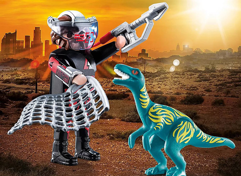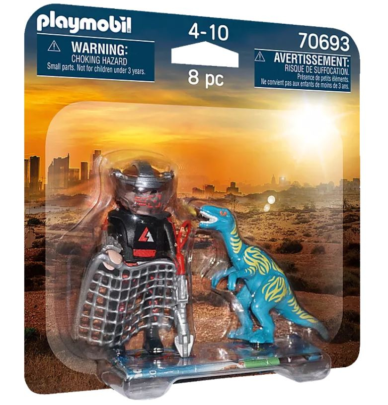 PLAYMOBIL DuoPack: Mednieks un Velociraptors. Gudrs mednieks seko dinozauram Velociraptoram. Viņš mēģina ievilināt dzīvnieku slazdā un noķert to ar tīklu. Vai viņam izdosies noķert dinozauru? PLAYMOBIL DuoPack komplektā ir divreiz vairāk jautrības! Ieteicams bērniem no 4 gadu vecuma. Brīdinājums! Nav piemērots bērniem līdz trīs gadu vecumam. Sīkas detaļas, aizrīšanās risks. Lietot pieaugušo uzraudzībā. Komplektā ietilpst mednieka figūriņa, dinozaurs Velociraptors, tīkls, mini dators, satvērējs, siksna. Komplektā 8 daļas.