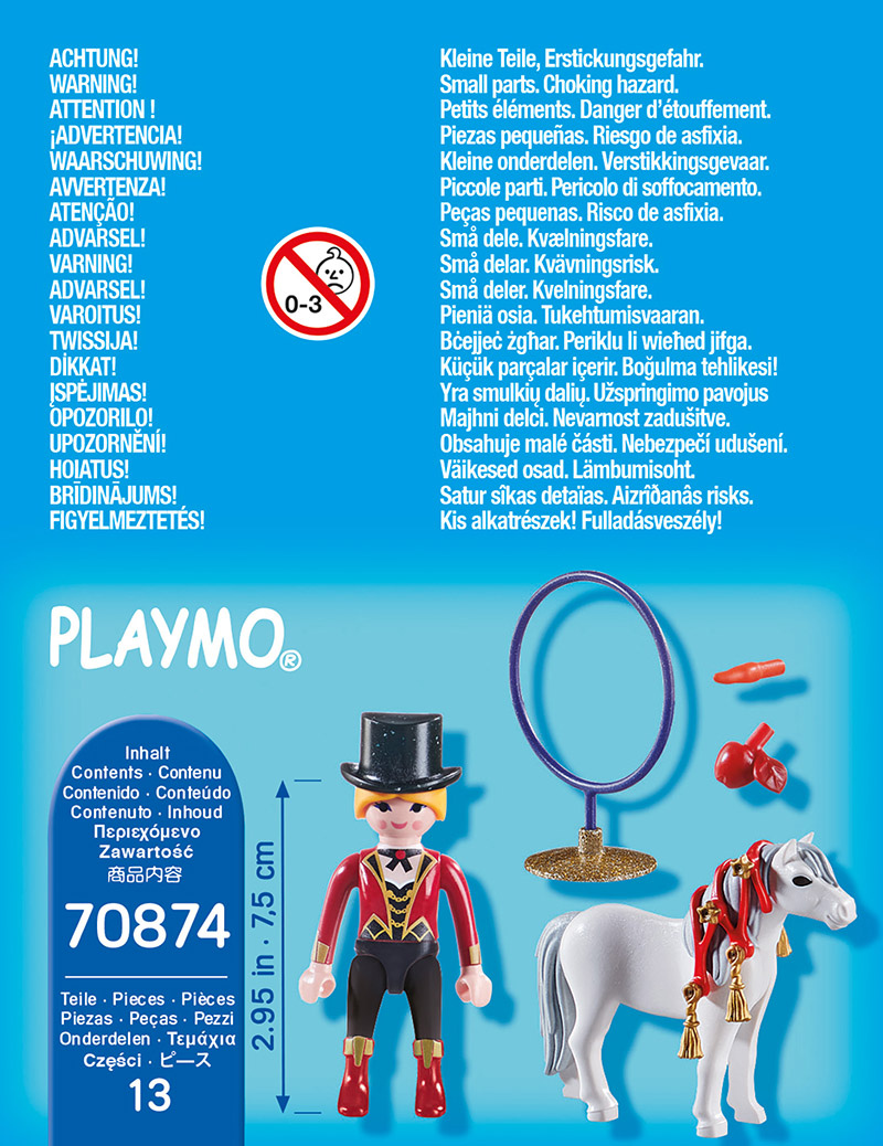 PLAYMOBIL Special Plus: Zirgu dresētāja. Liela uzticēšanās starp cilvēku un zirgu ir veiksmīgas dresūras pamats. Daudzus gadus viņi katru dienu ir veidojuši savu programmu. Šodien ir lielā uzstāšanās diena. Zirga krēpes ir svinīgi izrotātas, bet dresētāja valkā greznu tērpu. Priekškars paceļas! PLAYMOBIL Special Plus komplekti ir lieliska dāvana. Ieteicams bērniem no 4 gadu vecuma. Brīdinājums! Nav piemērots bērniem līdz trīs gadu vecumam. Sīkas detaļas, aizrīšanās risks. Lietot pieaugušo uzraudzībā. Komplektā ietilpst sievietes figūriņa, zirgs, dresūras riņķis, cepure, burkāns, ābols, zirga rotājumu komplekts. Komplektā 13 daļas.