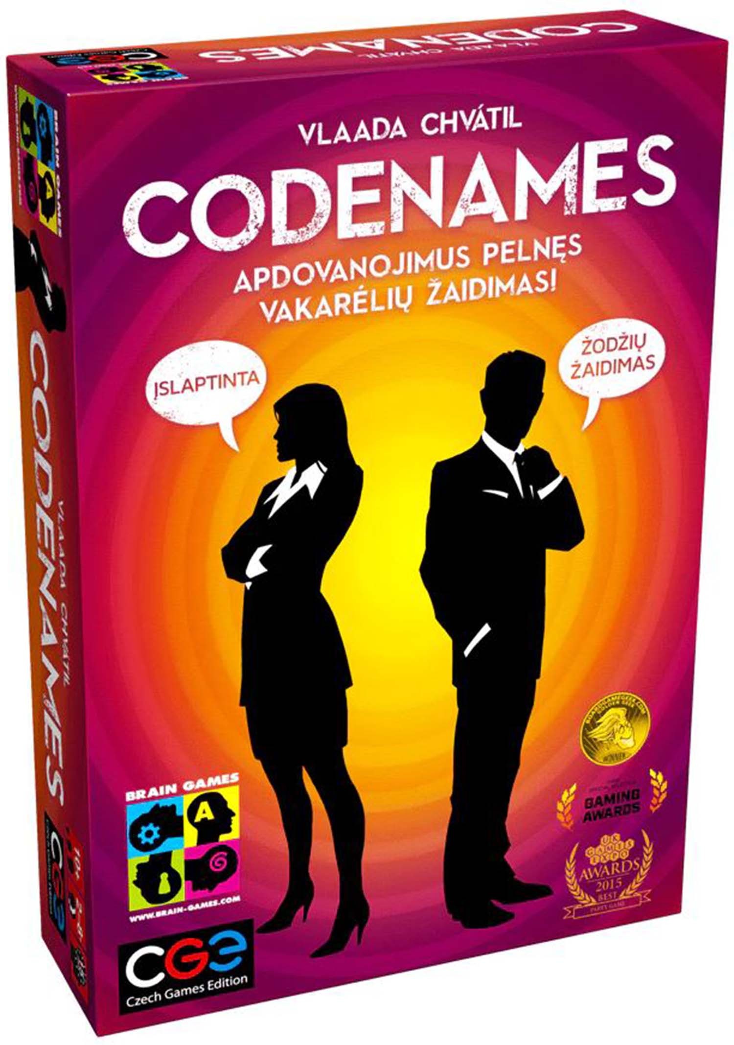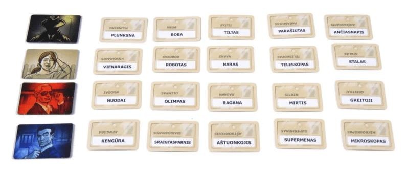 Codenames ir komandas saziņas spēle, kas lieliski piemērota gan ģimenēm, gan draugiem. Lieliska spēle jūsu ballītei. Codenames spēles laikā divas komandas sacenšas par to, kura pirmā sazināsies ar visiem saviem aģentiem. Katras komandas kapteinis pēc kārtas sniedz vienu vārdu lielas norādes, kas var norādīt uz vairākiem vārdiem laukumā. Viņu komandas biedri mēģina uzminēt savas komandas vārdus, izvairoties no tiem, kas pieder pretinieku komandai. Un visi vēlas izvairīties no slepkavas, jo, izvēloties to, tiek uzreiz zaudēts. Šī ir visā pasaulē zināma un iemīļota spēle, kas saņēmusi prestižo Spiel des Jahres balvu. Var spēlēt lielās grupās vai video konferenču laikā. Viegli iemācāmi noteikumi, interesanta un aizraujoša spēle. Ieteicams bērniem no 10 gadu vecuma. Brīdinājums! Nav piemērots bērniem, kas jaunāki par trim gadiem. Sīkas detaļas, aizrīšanās risks. Lietot pieaugušo uzraudzībā. Spēles ilgums 20 minūtes. Var spēlēt 2-8 spēlētāji. Apraksts lietuviešu valodā.