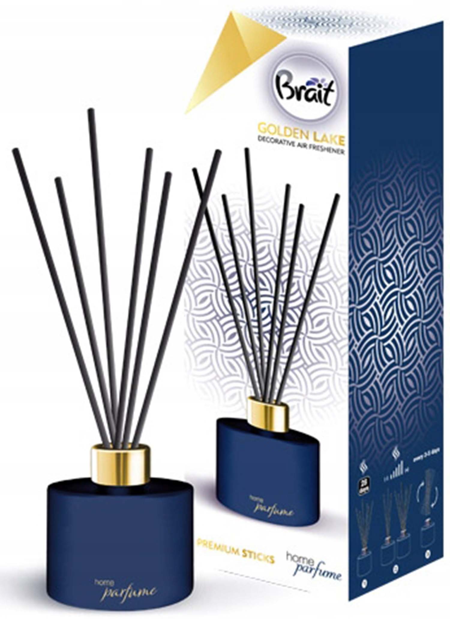 BRAIT Golden Lake mājas aromāts, 100 ml. Rožu, jasmīna un muskusa aromātu kombinācija. Tumši zila pudelīte ar zelta detaļām.