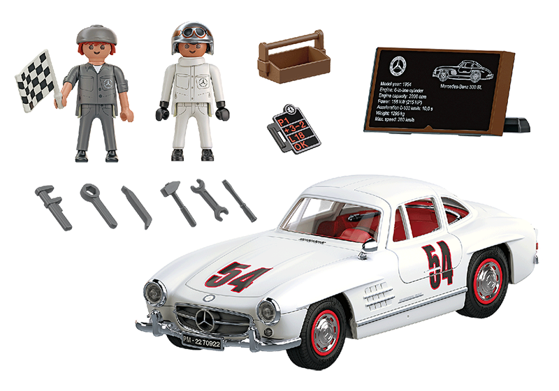 PLAYMOBIL Mercedes-Benz 300 SL. Šis sporta auto ar leģendārajām kaijas spārnu durvīm ir īsta klasika. Savā laikā tas tika uzskatīts par ātrāko sporta auto pasaulē. Mercedes-Benz 300 SL ir izcils sacīkšu rakstura un luksusa apvienojums. PLAYMOBIL modelim durvis veras uz augšu, lai varētu iesēdināt vadītāju. Instrumentu kasti var ērti ievietot bagāžniekā. Ieteicams bērniem no 5 gadu vecuma. Brīdinājums! Nav piemērots bērniem līdz trīs gadu vecumam. Sīkas detaļas, aizrīšanās risks. Komplektā ietilpst sacīkšu braucēja un mehāniķa figūriņas, auto, instrumenti un citi piederumi. Komplektā 46 detaļas.