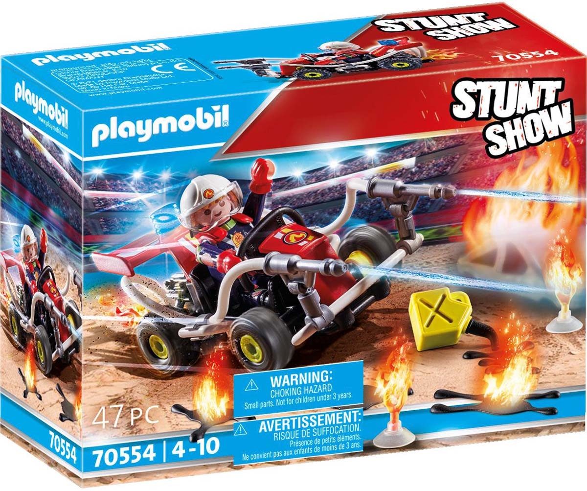 PLAYMOBIL Stuntshow: Ugunsdzēsēju kartings. Kaskadieru šova laikā bieži uzliesmo uguns. Ja tas notiek, ugniēdzēsēju kartings vienmēr ir gatavs. Manevrētspējīgais kartings ar diviem ugunsdzēšamajiem aparātiem var ātri nokļūt jebkurā vietā. Ar to var kontrolēt pat naftas ugunsgrēkus! Ieteicams bērniem no 4 gadu vecuma. Brīdinājums! Nav piemērots bērniem līdz trīs gadu vecumam. Komplektā ietilpst vadītāja figūriņa, kartings, liesmas un eļļas peļķes. Komplektā 47 detaļas.