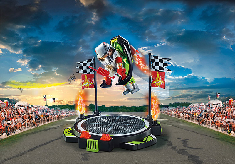 PLAYMOBIL Stuntshow: Kaskadieris ar reaktīvo lidaparātu. Tikai īsts kaskadieris uzdrīkstas pacelties debesīs ar reaktīvo lidaparātu. Viņš stāv uz pjedestāla un māj skatītājiem, tad iedarbina dzinējus un paceļas gaisā arvien ātrāk un ātrāk. Ieteicams bērniem no 5 gadu vecuma. Brīdinājums! Nav piemērots bērniem līdz trīs gadu vecumam. Komplektā ietilpst figūriņa, pjedestāls, lidaparāts, karogi un liesmas. Komplektā 27 detaļas.