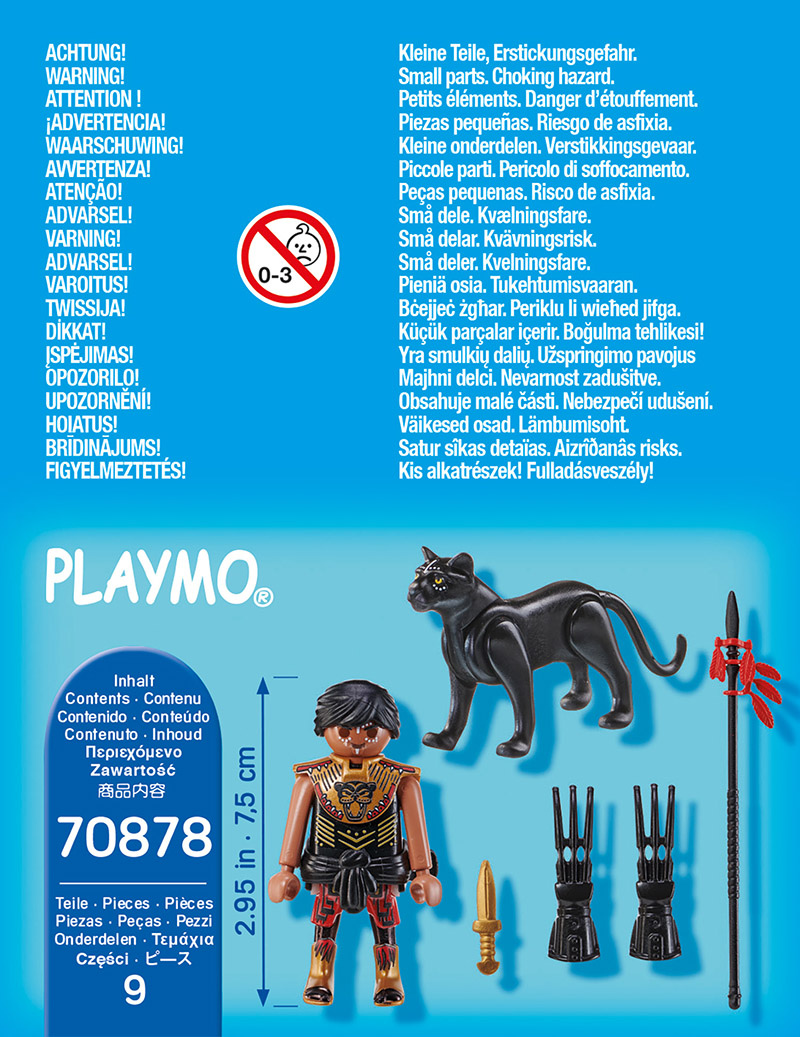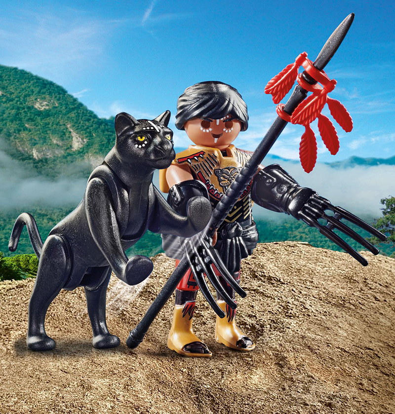 PLAYMOBIL Special Plus: Karotājs ar panteru. Drosmīgs karotājs klīst stepēs ar melnu panteru sev blakus. Viņš izskatās patiesi iespaidīgi ar karotāja cimdiem un krāsotu seju. Ieteicams bērniem no 4 gadu vecuma. Komplektā ietilpst figūriņa, pantera, šķēps, naga cimdi un siksna. Komplektā 9 detaļas.