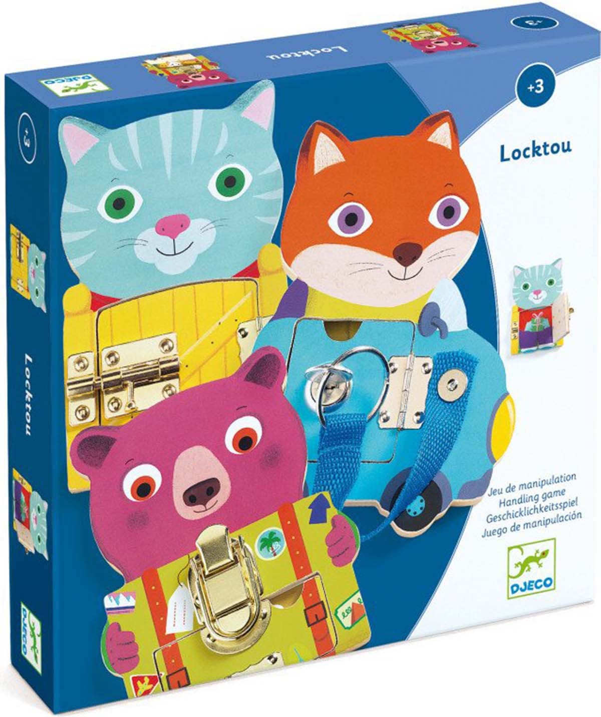 Atslēgu un aizslēgu komplekts Dzīvnieki. Palīdz bērnam saprast, kā darbojas dažāda veida slēdzenes, un uzlabo motoriku. Komplektā 3 dzīvnieku figūriņas ar dažādiem aizslēgiem. Ieteicams bērniem no 3 gadu vecuma.