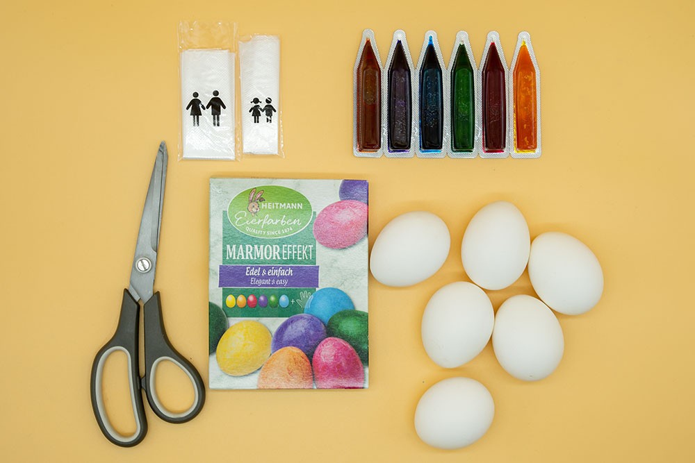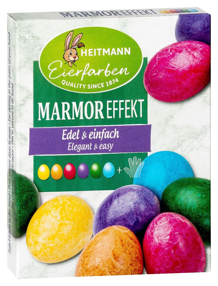 Ar šīm HEITMANN krāsām Marmora efekts pagatavosiet Lieldienu olas, kas atgādinās marmora faktūru. Elegantam efektam varat jaukt krāsu toņus. Izžuvušas olas dabiski spīd. Piemērots gan baltām, gan brūnām olām. Kā lietot? Izvāriet olas un turiet tās siltas. Nosusiniet olu. Piliniet krāsu uz cimdā tērptas plaukstas, sāciet ar gaišākajām, sadaliet. Uzklājiet krāsu ar plaukstu uz olas, necentieties to darīt vienmērīgi. Ļaujiet krāsai nožūt, kamēr tā vairs nelīp. Interesantākam efektam pamēģiniet jaukt krāsas. Iepakojumā šķidras dzeltenas, sarkanas, purpura, zaļas un zilas krāsas pārtikas krāsas (pa 5 ml), 2 pāri cimdu (pieaugušajam un bērnam).
