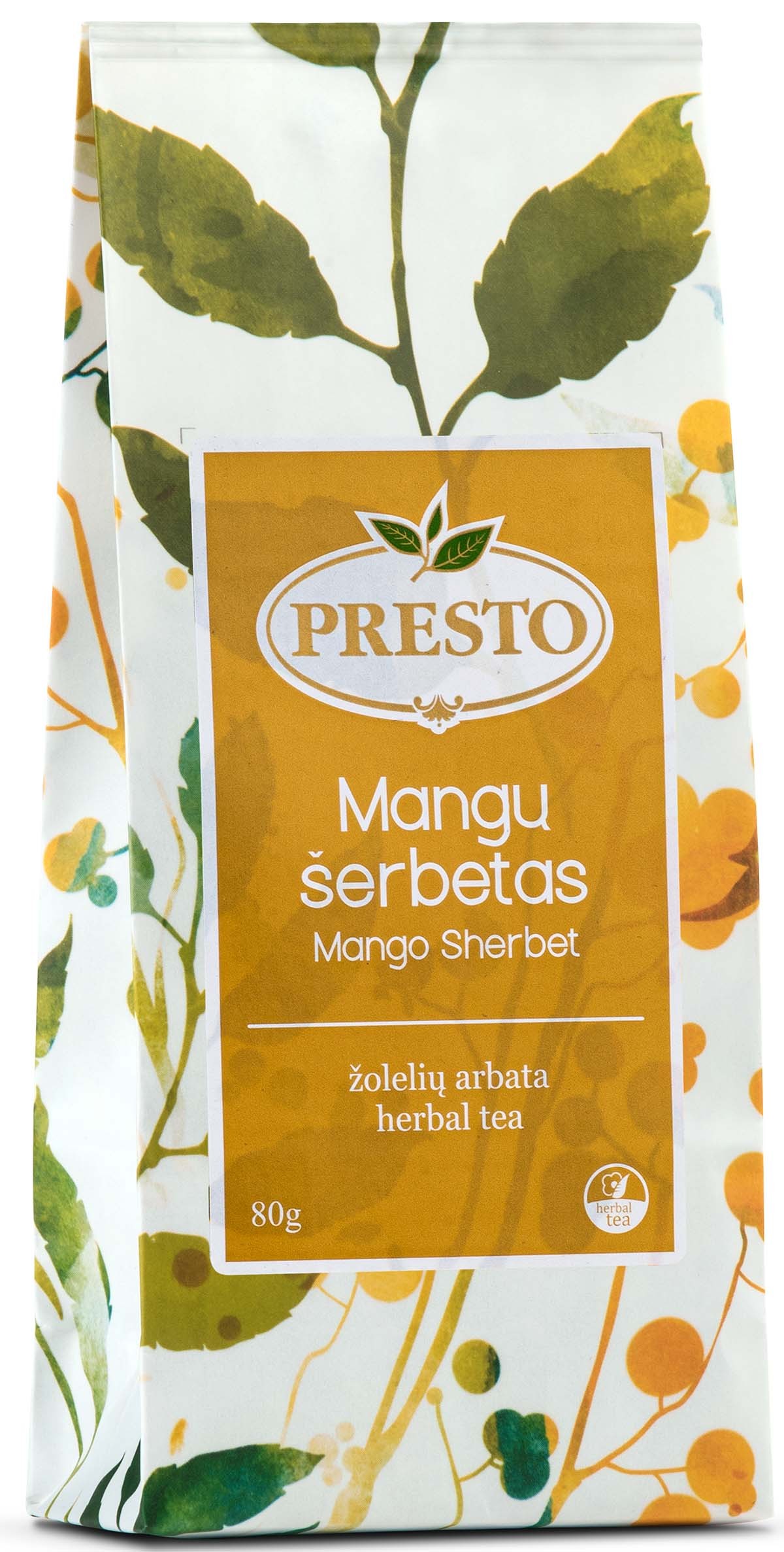 Ārstniecības augu birstošā tēja PRESTO Mangų šerbetas (Mango šerberts), 80 g. Ābolu, mango (mango, cukurs), datuļu gabaliņi (dateles, rīsu milti), kazeņu, melisas, zīdkoka lapiņas, citronzāle, mežrozītes, burkānu gabaliņi, verbenas, kaņepju lapiņas, kliņģerīšu ziedlapiņas, dabīga aromātviela.