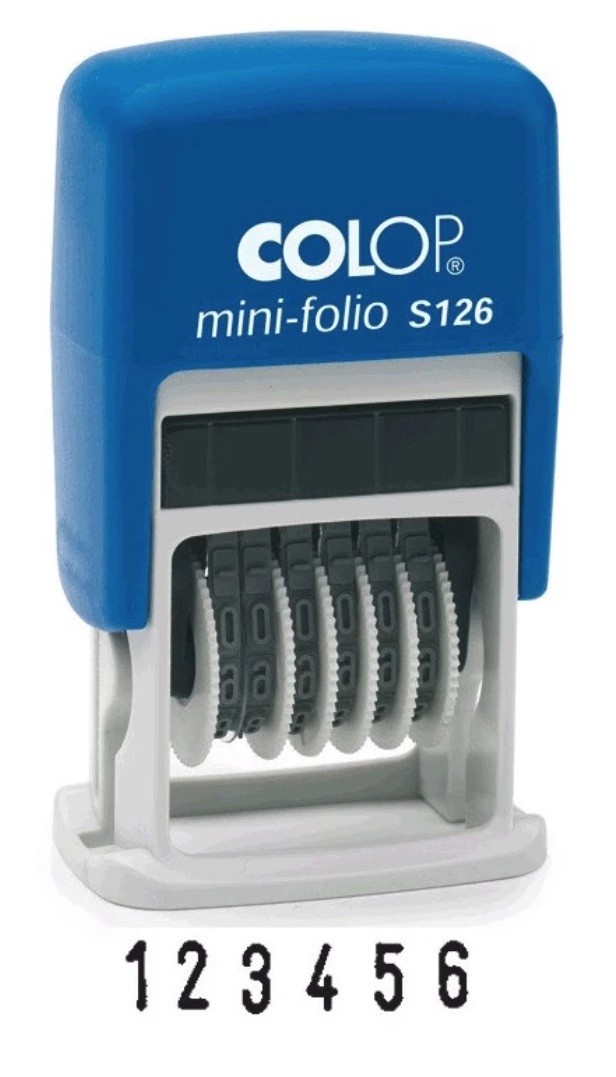 Zīmogs-numerators COLOP Mini-Folio S126. Ciparu augstums 4 mm. Komplektā ar zilas krāsas tušas spilventiņu.