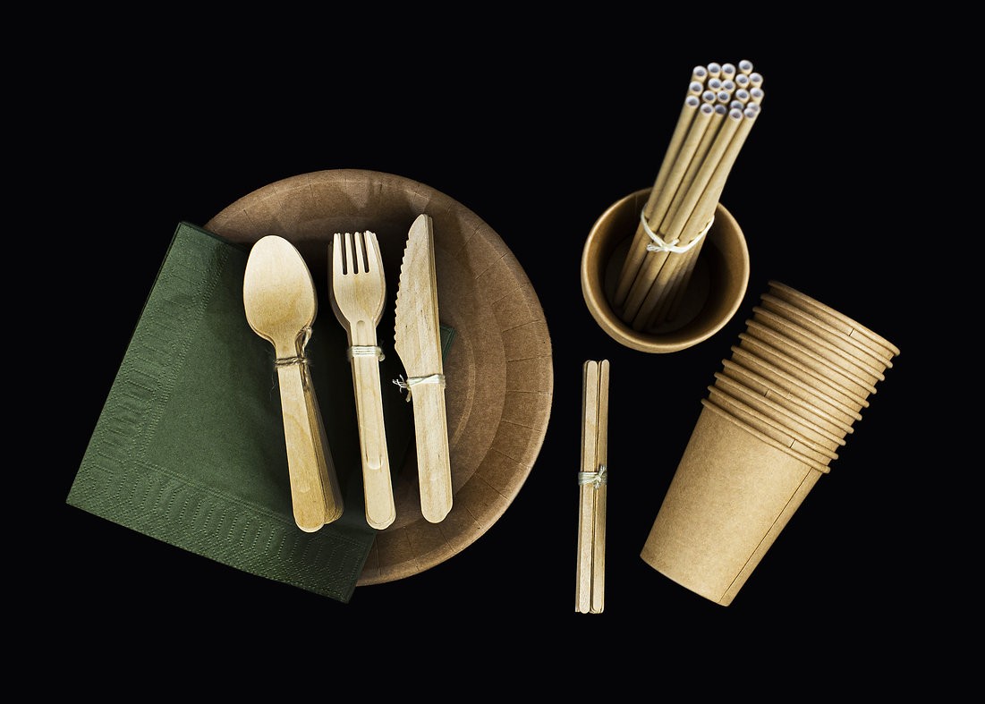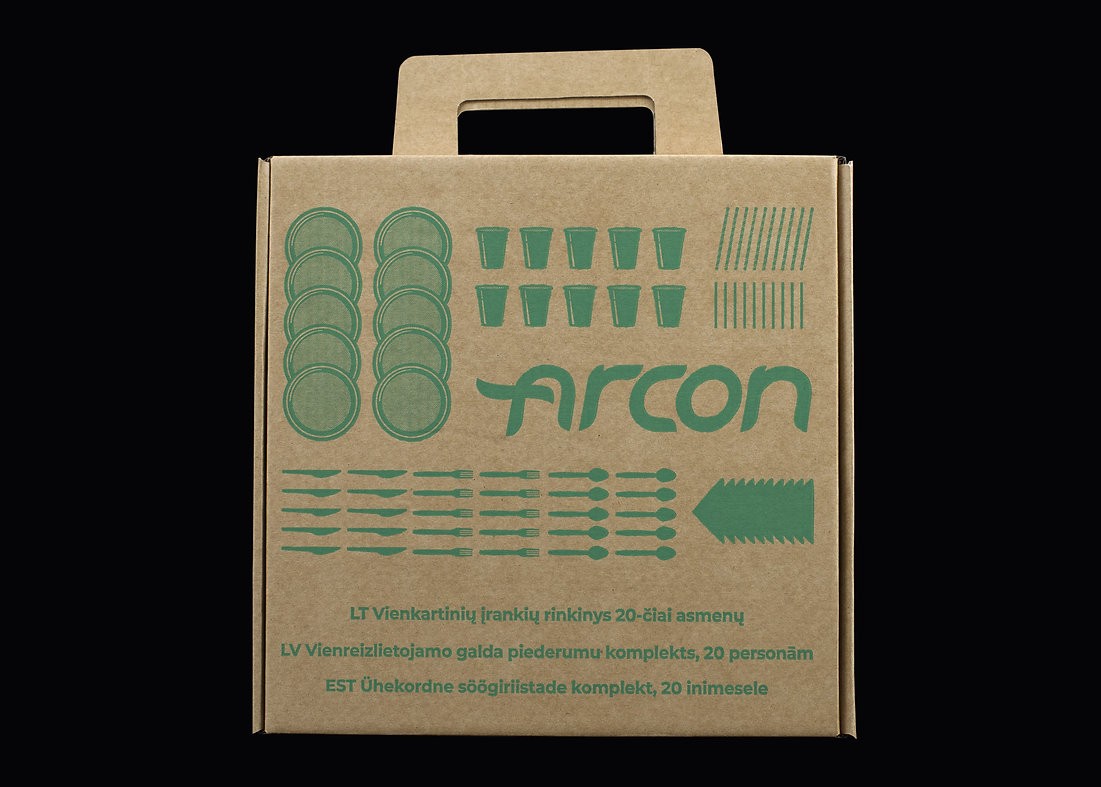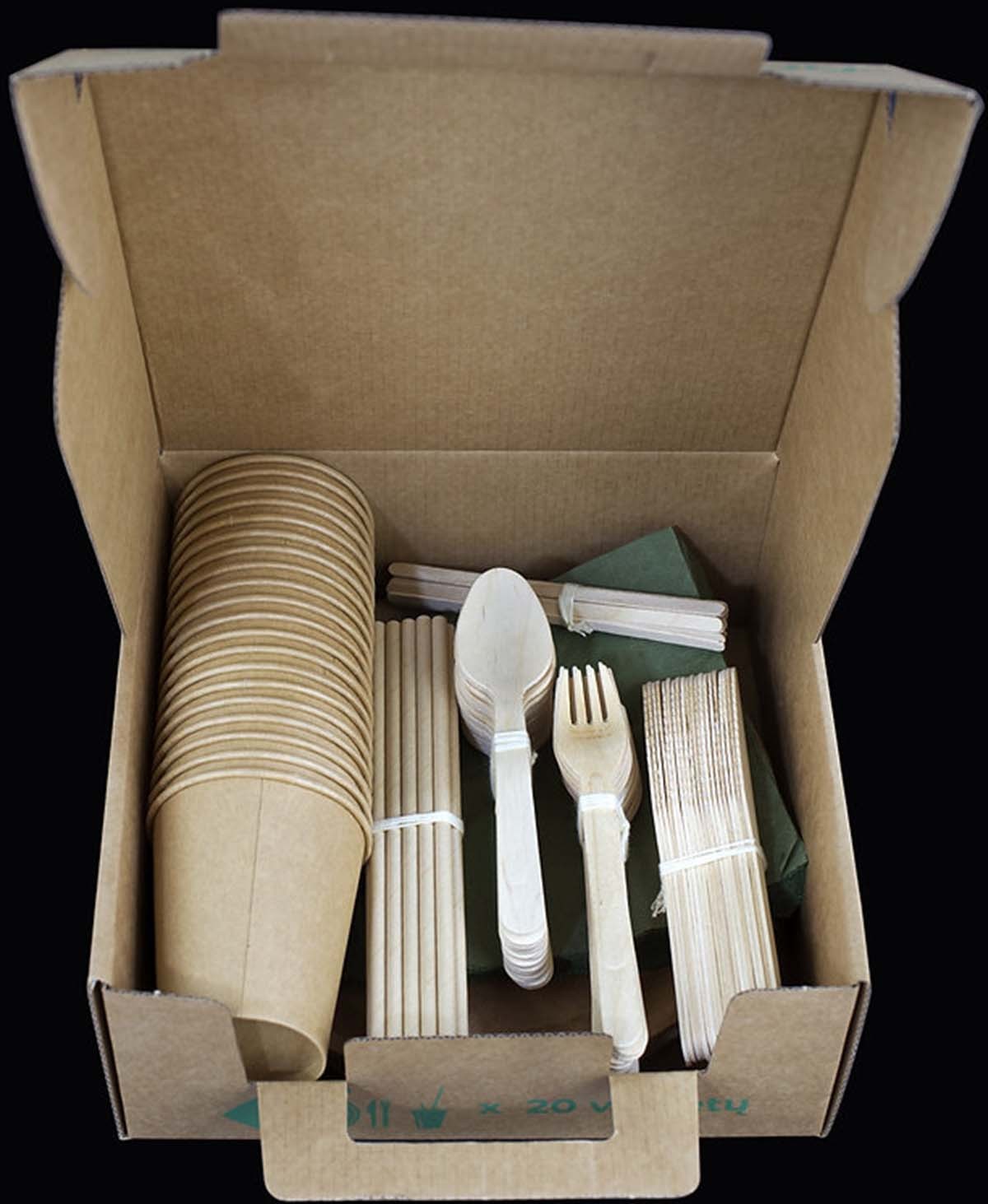 Vienreizlietojamo trauku komplekts 20 personām, kuru veido: koka dakšiņas (20 gab.), koka karotes (20 gab.), koka naži (20 gab.), kraftpapīra šķīvji (20 gab.), kraftpapīra viensienas krūzes karstajiem dzērieniem, 250 ml (20 gab.), kraftpapīra salmiņi, 197 mm gari un 6 mm diametrā (20 gab.) un salvetes (20 gab.). Iepakots ekoloģiskā kastē ar rokturi, ko ir ērti transportēt un nest rokā.