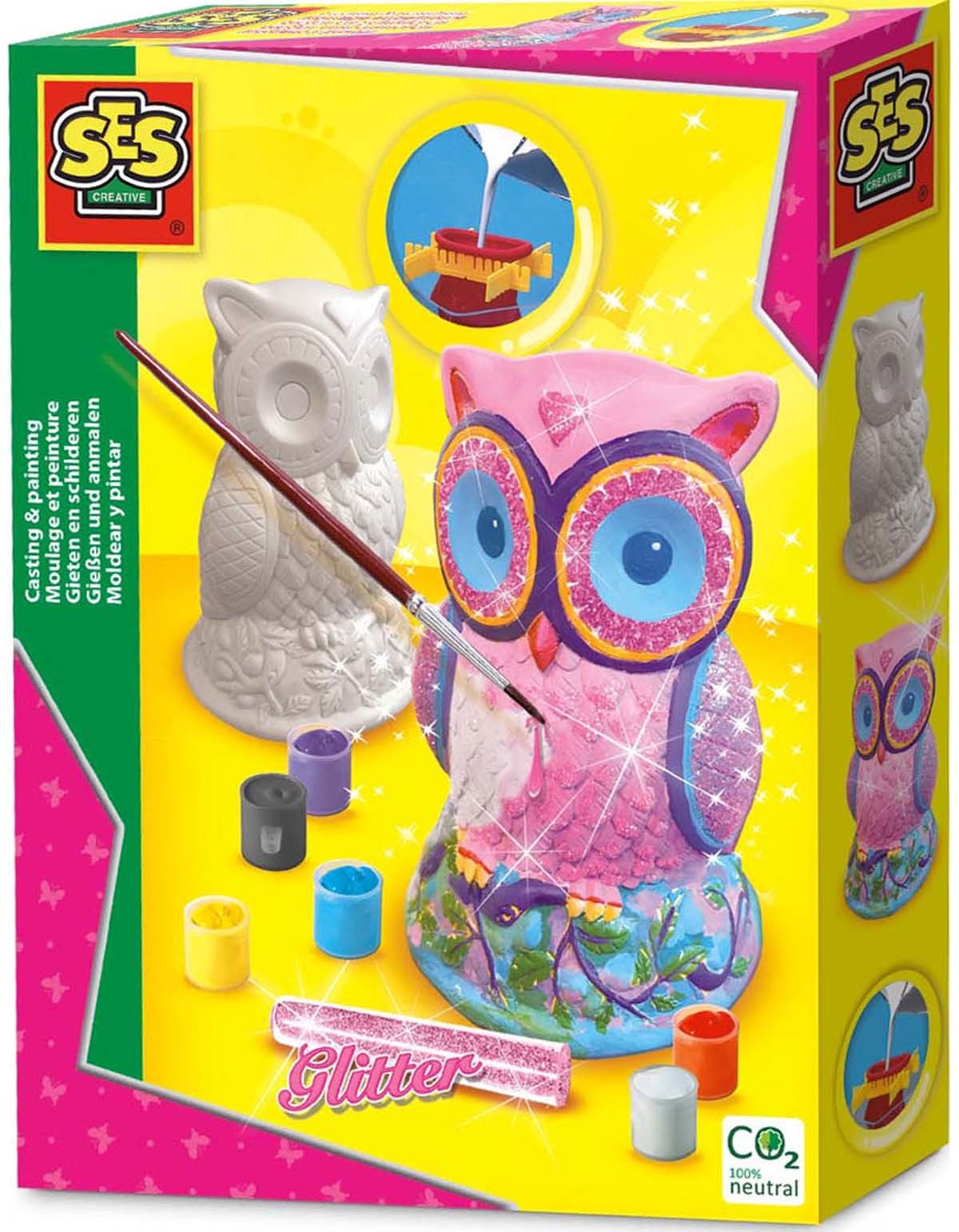 Izveido ģipša pūču figūriņas! Ielej formiņās drošu ģipša maisījumu, pagaidi, līdz tas sacietē un izžūst, un pēc tam nokrāso savas pūcītes ar komplektā esošajām krāsām un izrotā ar spīdumiem! Šis komplekts ir lielisks veids, kā attīstīt radošumu, sīko motoriku un koncentrēšanās spējas. Ieteicams bērniem no 5 gadu vecuma. Brīdinājums! Nav piemērots bērniem līdz 3 gadu vecumam, satur sīkas detaļas. Aizrīšanās risks! Lietot pieaugušo uzraudzībā. Komplektā ir: 1 formiņa, 6 krāsu trauciņi, rozā spīdumi, 1 otiņa, 1 paciņa ģipša, 4 plastmasas turētāji.