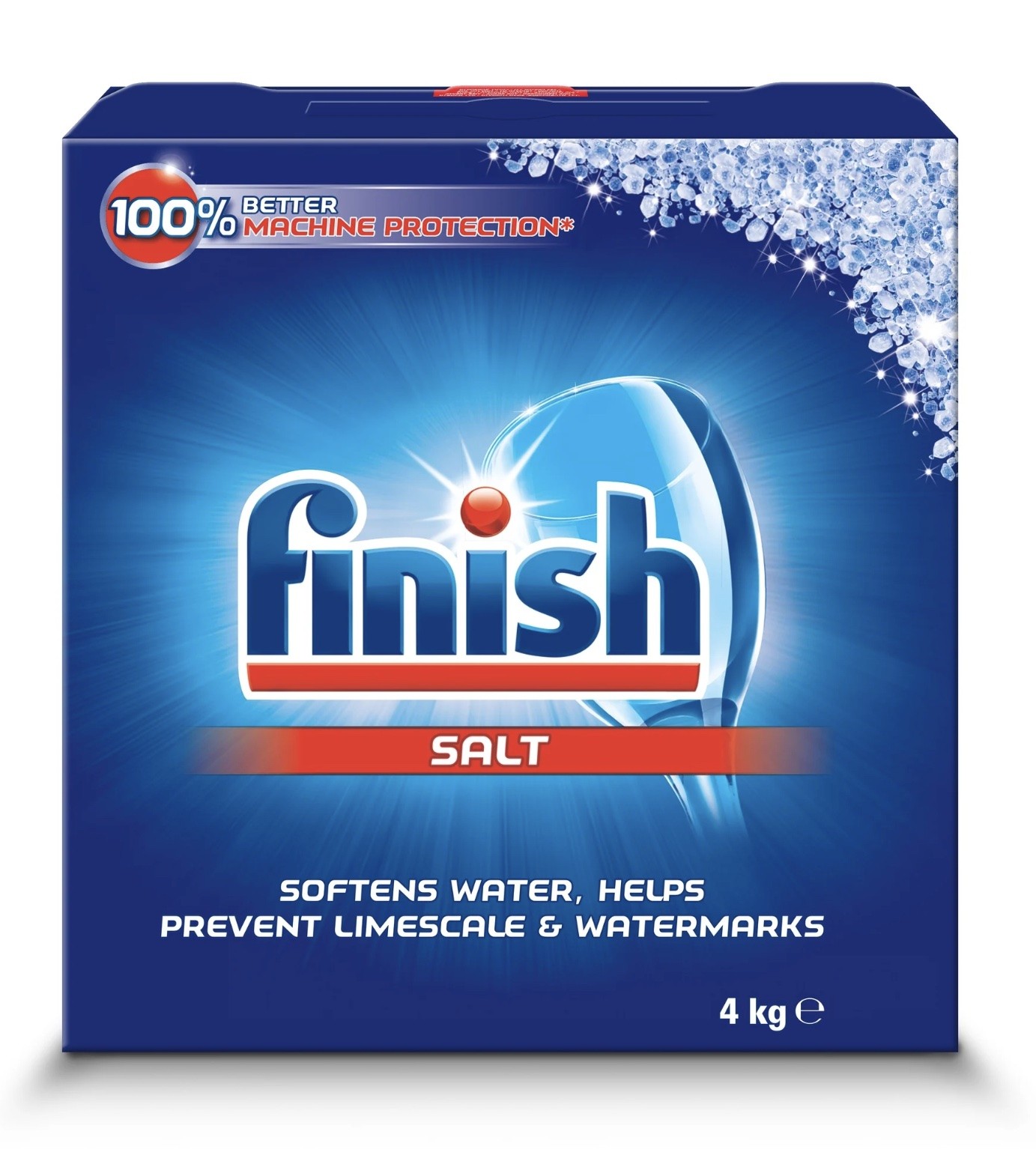 Trauku mazgājamās mašīnas sāls FINISH (4 kg). Granulēta sāls ar 99% tīrību. Mīkstina ūdeni, uzlabo mašīnas efektivitāti, pasargā no kaļķakmens nogulsnēm un ūdens pēdām uz traukiem. Ieteicama cietam ūdenim. Svars: 4 kg.