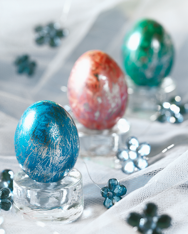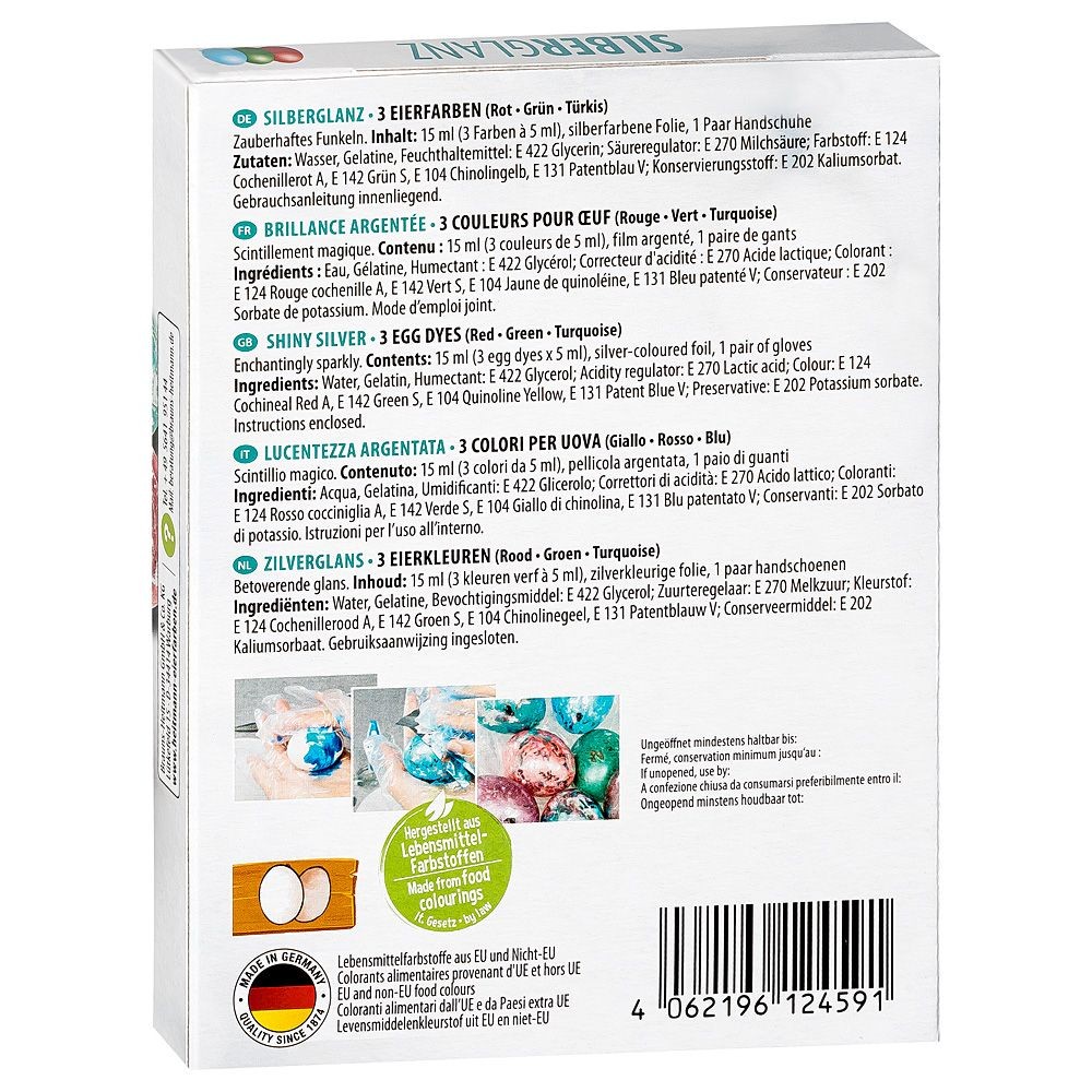 Ar šīm HEITMANN krāsām Sudraba mirdzums pagatavosiet svinīgas Lieldienu olas, kas izskatīsies kā īsti mākslas darbi. Olas tiek krāsotas ar rokām, uzvelkot cimdus. Brīnišķīgu sudraba spīdumu iegūsiet, ieberzējot ar speciālu sudraba foliju. Piemērots balto un brūno olu krāsošanai. Olas krāsot var ne tikai Lieldienām, bet arī citiem svinīgiem gadījumiem. Kā lietot? Izvāriet olas un turiet tās siltas. Iemērciet atdalītos krāsu iepakojumus karstā ūdenī ar galiņiem uz augšu. Kad krāsa kļūs šķidra, nogrieziet iepakojuma galu. Nosusiniet olu. Piliniet aptuveni 15 pilienus krāsas uz cimdā tērptas plaukstas, sāciet ar gaišākajām, vienmērīgi sadaliet. Uzklājiet krāsu ar plaukstu uz olas. Ļaujiet krāsai nožūt, kamēr tā vairs nelīp. Tad nekavējoties berzējiet olu ar folijas matēto pusi; lai labāk redzētu, paberzējiet ar nagu vai karotes kātu. Pirms ņemat citu krāsu, tīri noslaukiet cimdus. Komplektā ietilpst sarkana, zaļa un tirkīza krāsas pārtikas krāsa (pa 5 ml), sudraba folija, cimdi.
