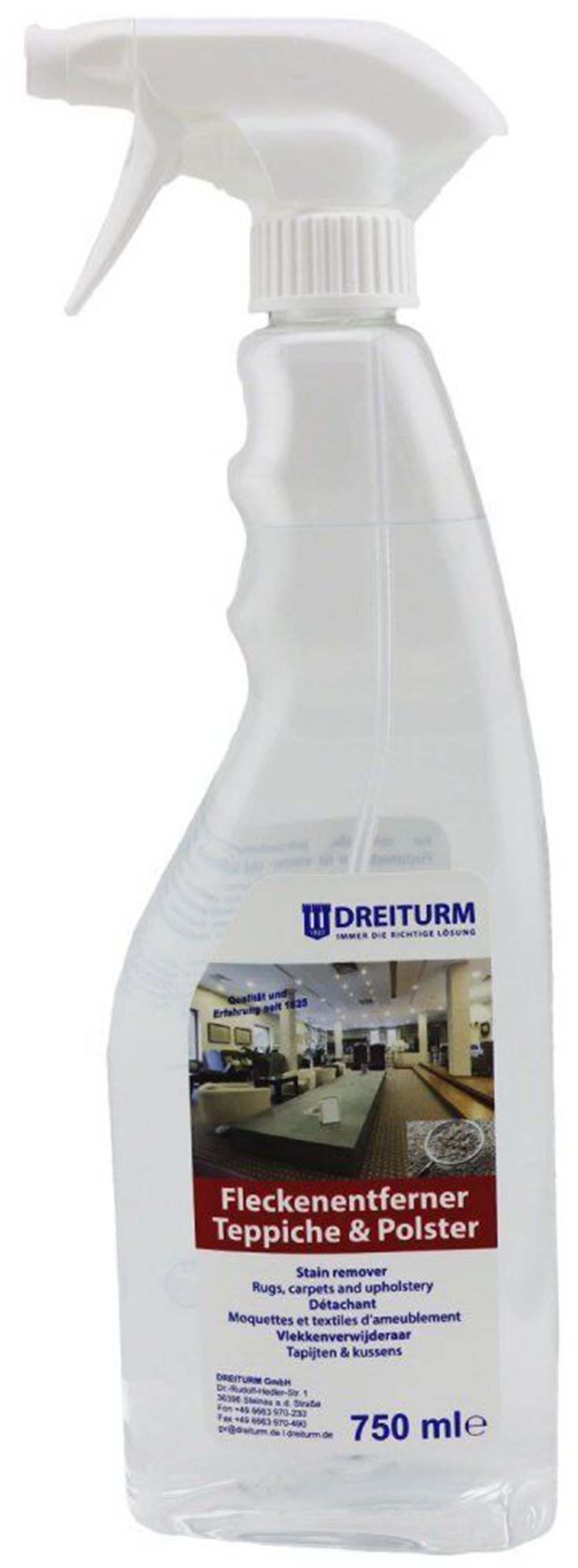 Universāls, lietošanai gatavs paklāju un mīksto mēbeļu traipu tīrītājs DREITURM FLECKENTF, 750 ml. Paredzēts ūdens un nedaudz sārmu izturīgiem paklājiem un polsterējumiem.