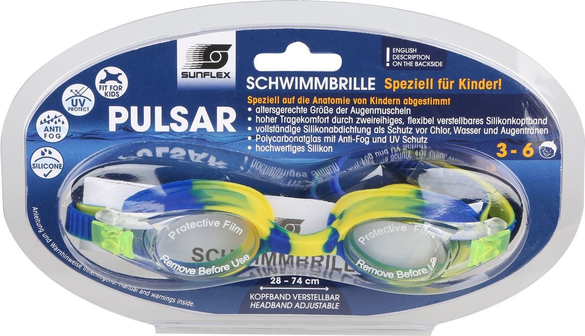 Uzvelciet šīs peldēšanas brilles un ienirstiet dziļi! Ar SUNFLEX peldēšanas brillēm Pulsar jūs redzēsiet visu ainu gan zem, gan virs ūdens. Acu bļodiņu izmērs ir īpaši pielāgots bērniem vecumā no 3 līdz 6 gadiem. Triecienizturīgās polikarbonāta acu bļodiņas neaizsvīst un aizsargā pret UV stariem. Silikona polsterējums nodrošina briļļu hermētiskumu. Tās aizsargā pret ūdeni un hloru, palīdzot novērst acu nogurumu. Augstas kvalitātes divrindu silikona galvas saite labi satveras aiz galvas aizmugures un ir regulējama no 28 līdz 74 cm. Ļoti mīkstais un elastīgais SUNFLEX peldēšanas briļļu Pulsar rāmis nodrošina maksimālu komfortu un prieku mazajiem peldēšanas laikā.