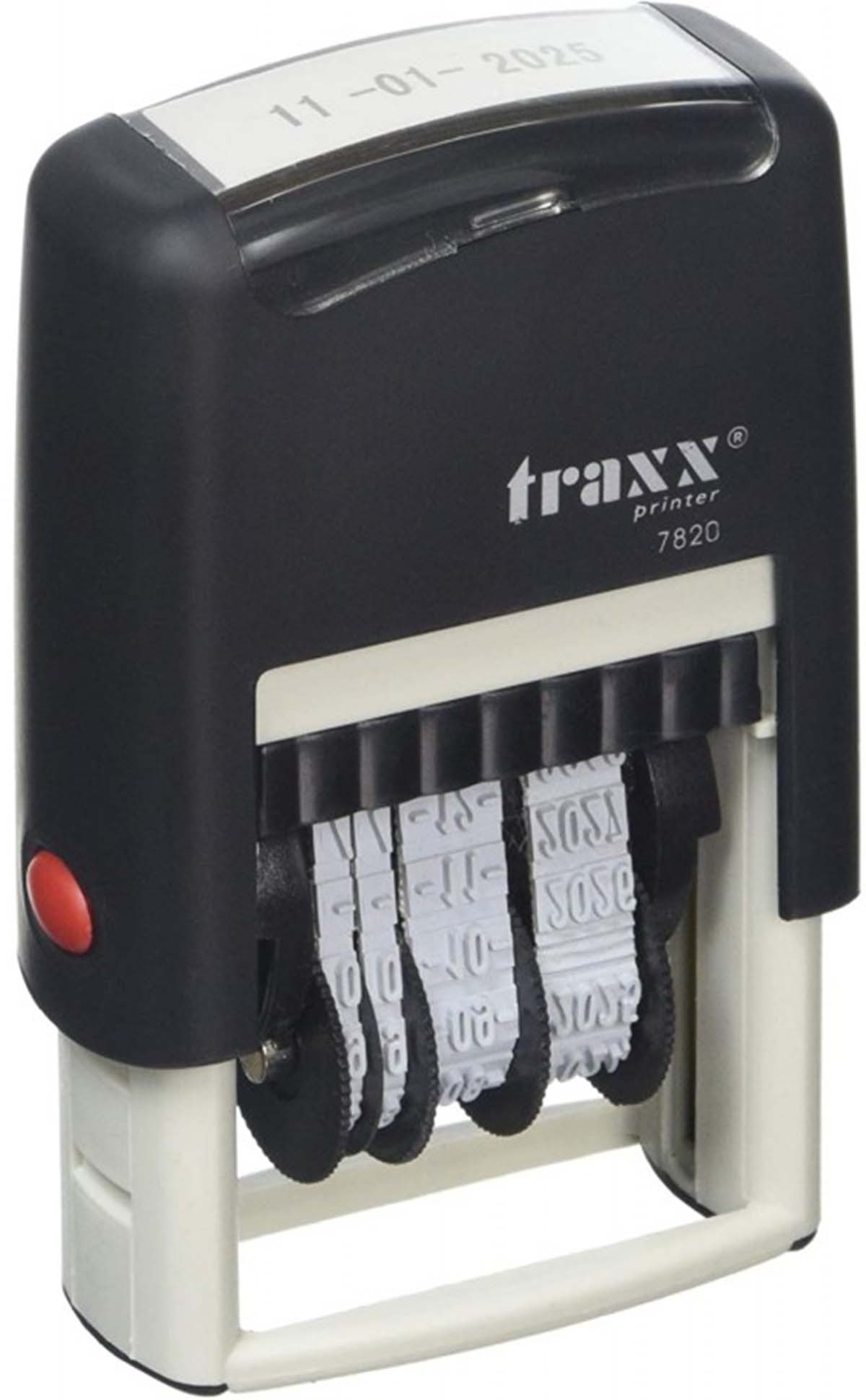 Zīmogs-datators TRAXX 7820. Nodrošina ērtu un stabilu zīmogošanu. Ciparu augstums 4 mm. Mēneši norādīti ar cipariem. Nomaināms spilventiņš. Korpusa krāsa: melna. Tintes krāsa: melna.