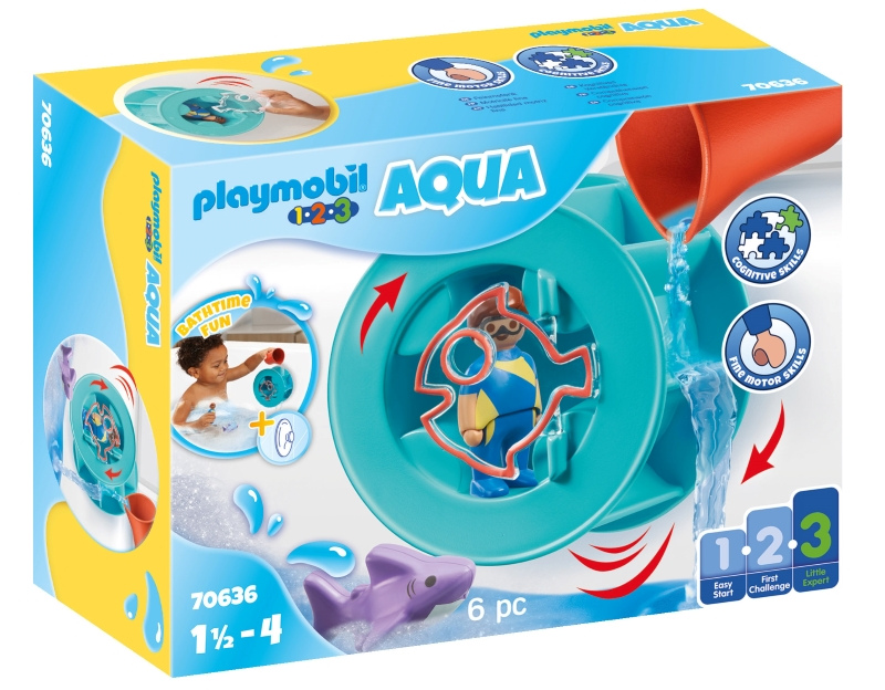 PLAYMOBIL 1.2.3 Aqua: Ūdens virpulis. Vai esi gatavs jautriem ūdens eksperimentiem? Uzmanīgi lej ūdeni, un rats sāks kustēties, griežot līdzi ūdenslīdēju vai haizivi. Ar piesūcekni piestiprini ratu pie vannas malas un sāc jautrību! Šis komplekts attīsta motoriku un radošumu. Ieteicams bērniem no 3 gadu vecuma.