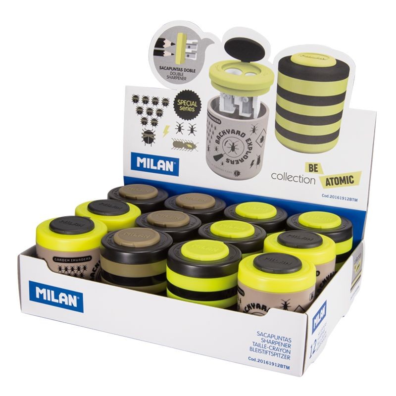 Asināmais MILAN Be Atomic, dubultais. Dubultais zīmuļu asināmais (viens standarta caurums un viens MAXI) ar tvertni. Praktisks uzskrūvējams vāciņš. Lieliski piemērots dažādu veidu zīmuļiem. Ideāli piemērots lietošanai skolā. Krāsa tiek izvēlēta nejaušā secībā, izvēlēties nav iespējas.