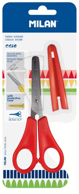Šķēres MILAN, sarkanas, 14,7 cm. Skolas šķēres ar nerūsējošā tērauda asmeņiem un noapaļotiem galiem. Plastmasas rokturis. Ideāli piemērotas pirmajiem mācību gadiem. Garums: 14,7 cm.