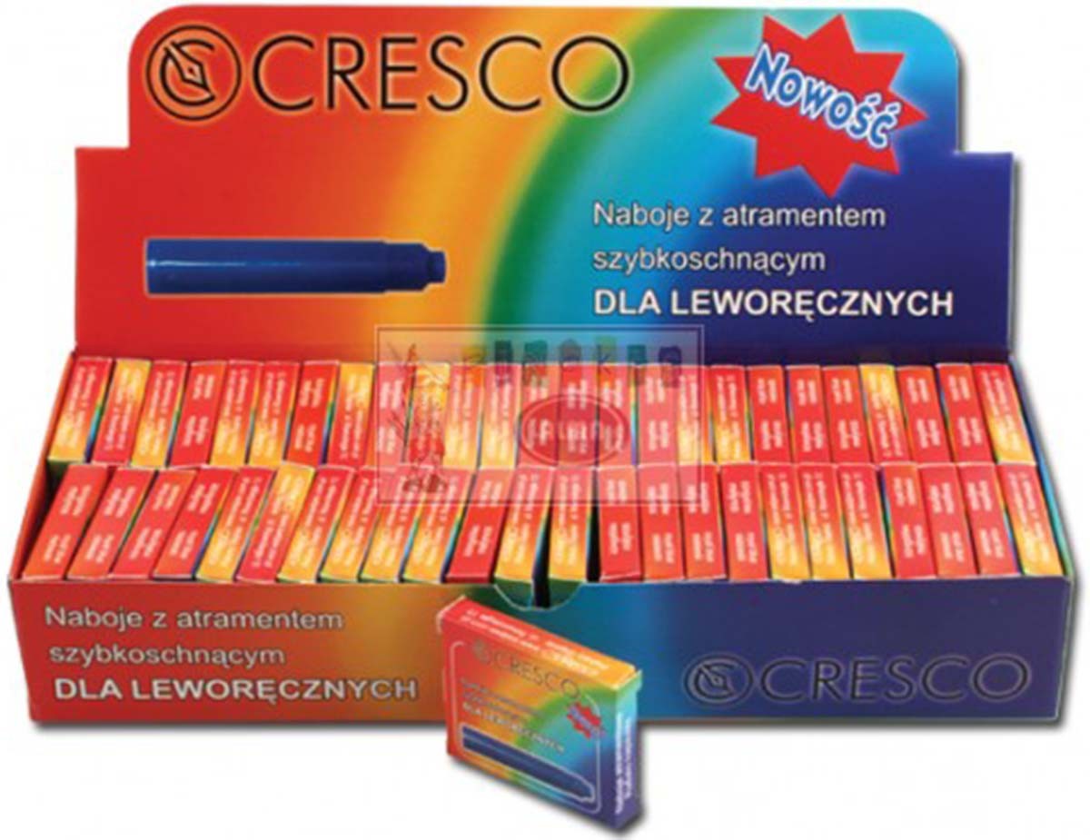 Tintes kapsulas kreiļiem CRESCO, zilas. Ātri žūstoša tinte novērš izsmērēšanos rakstot ar kreiso roku. Iepakojumā 6 gab.