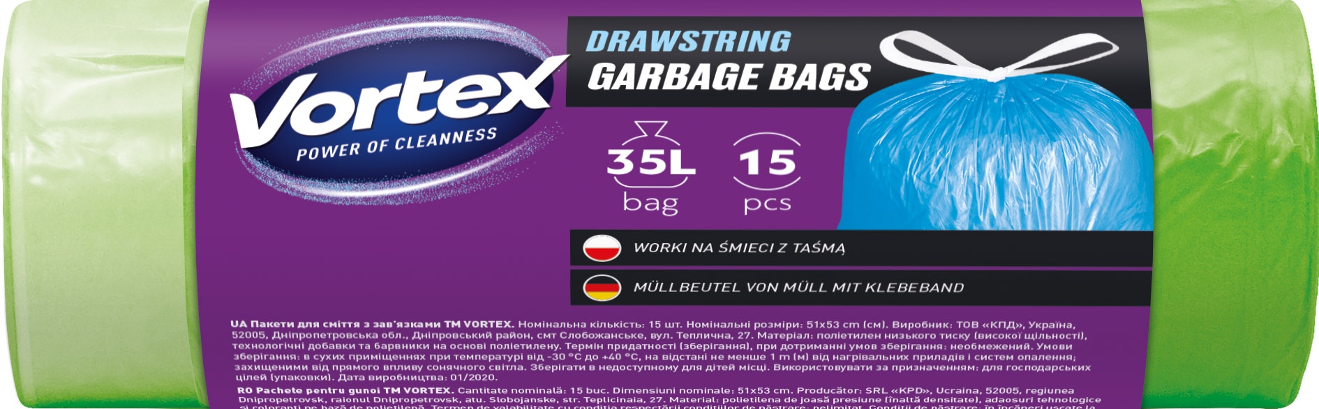 Atkritumu maisi VORTEX, 35 l, 15 gab., biezums 13 μm, HDPE, zaļi
