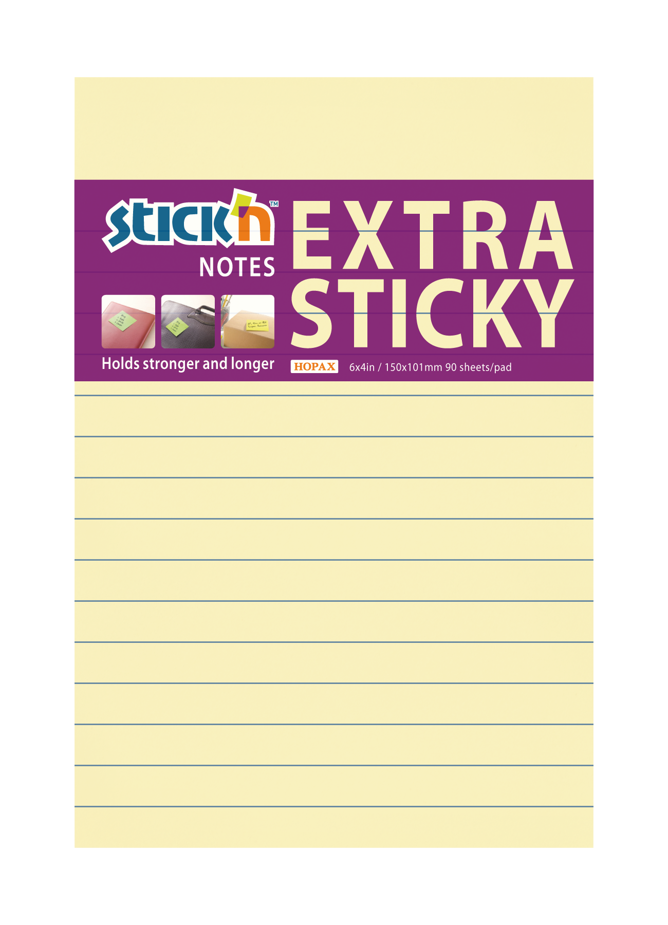 Superlīmveida piezīmju lapiņas STICK´N, 150 × 101 mm, 90 lapas, līnijotas, dzeltenas