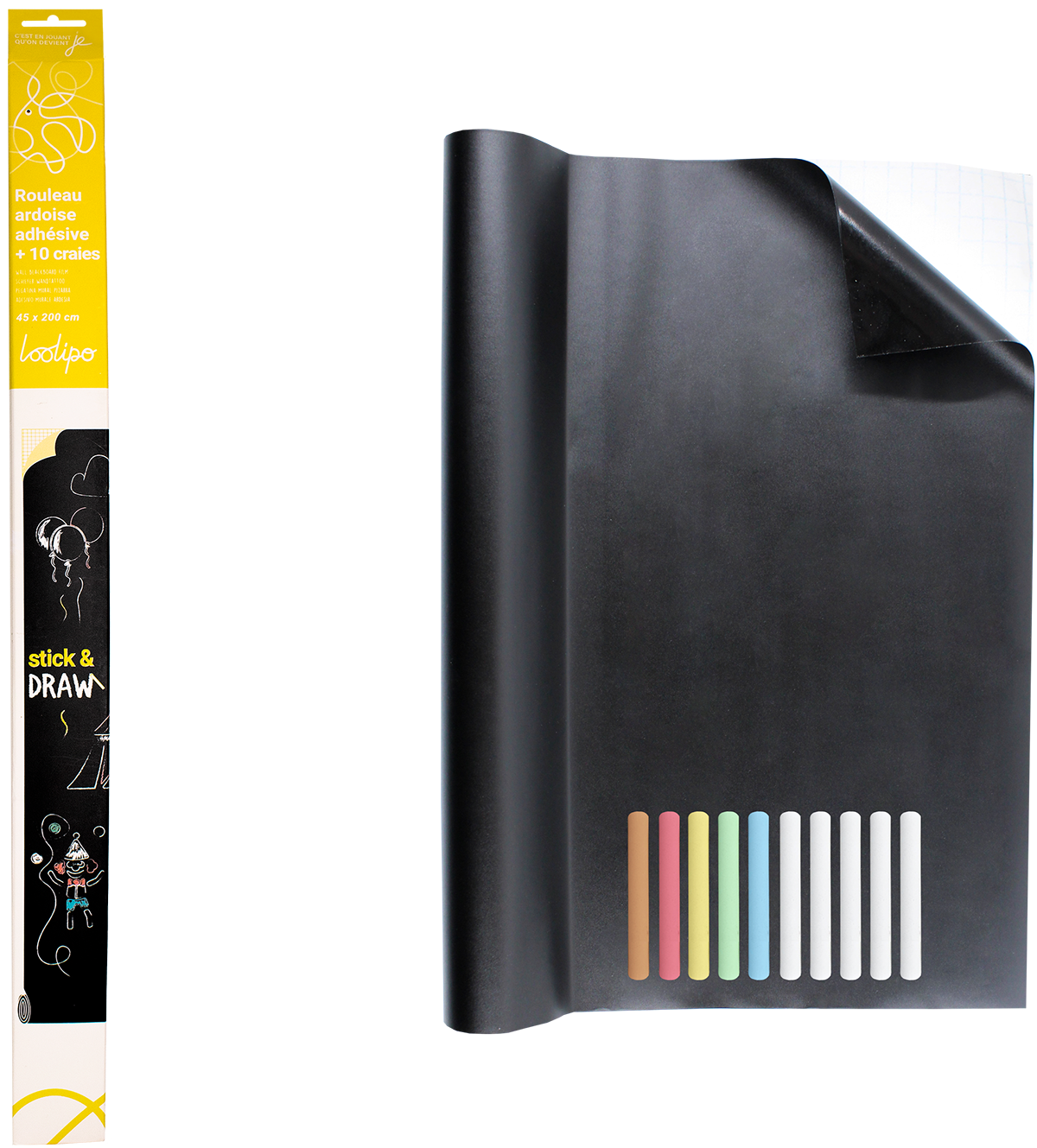 Līmējamā loksne rakstīšanai un zīmēšanai LOOLIPO, ar 10 krītiņiem, 45x200 cm